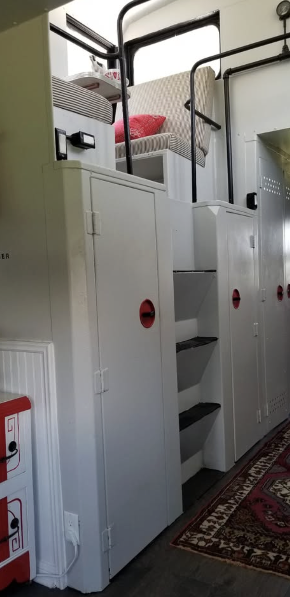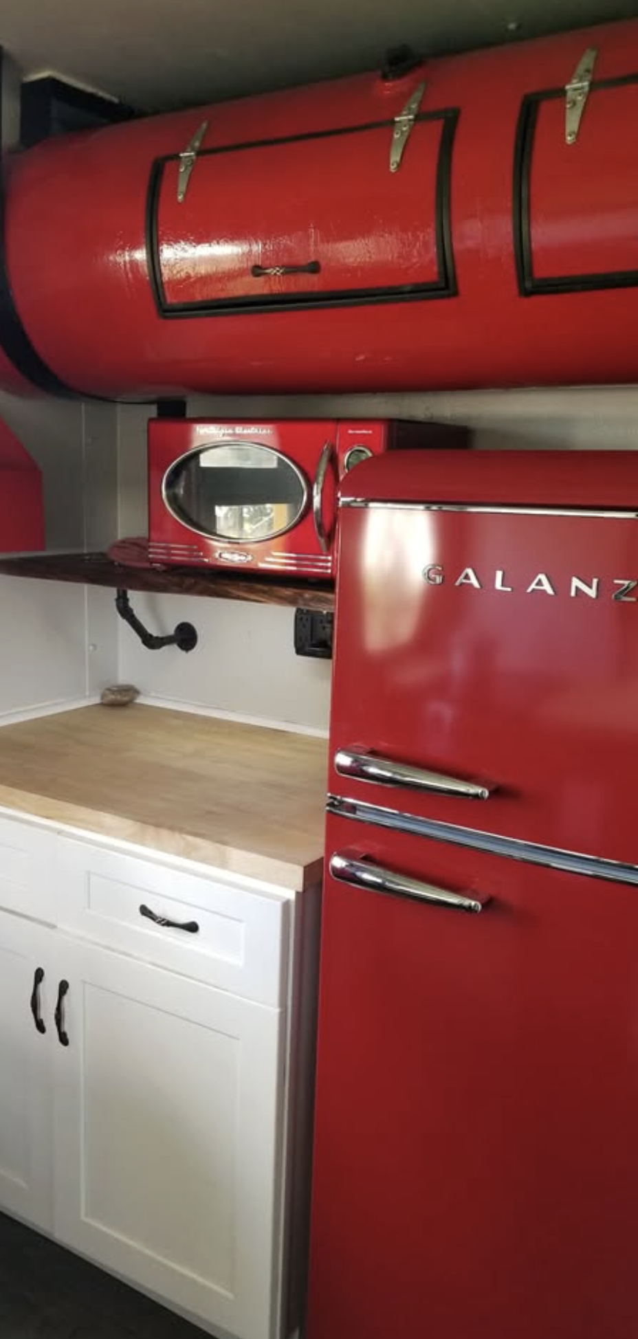 The kitchen occupies one end of the Caboose and consists of butcher block counter tops, a copper hammered sink, a dishwasher (!), a propane stove/oven and a retro red fridge, and microwave that sits on a live edge pecan slab. What was the water tank has been cleverly converted to shiny red cabinets.