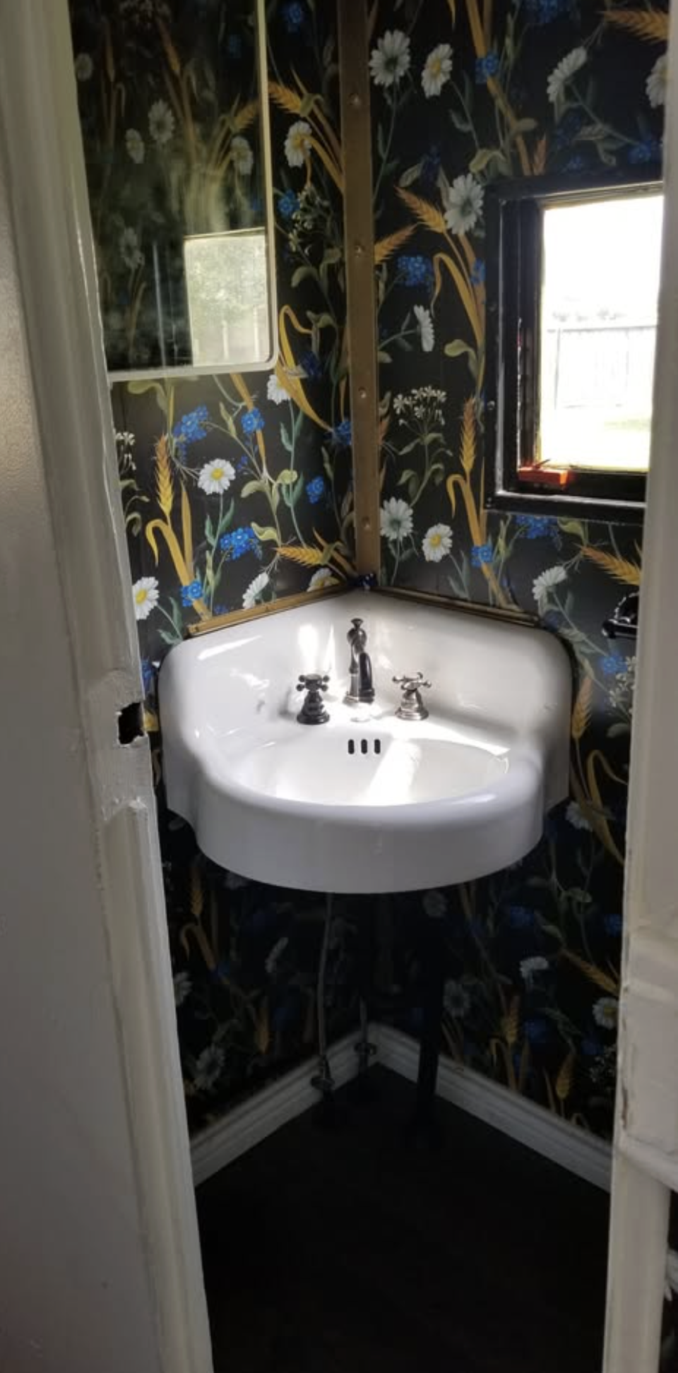 The bathroom sink is the original corner piece, while the stunning wallpaper and crystal chandelier soften the look.