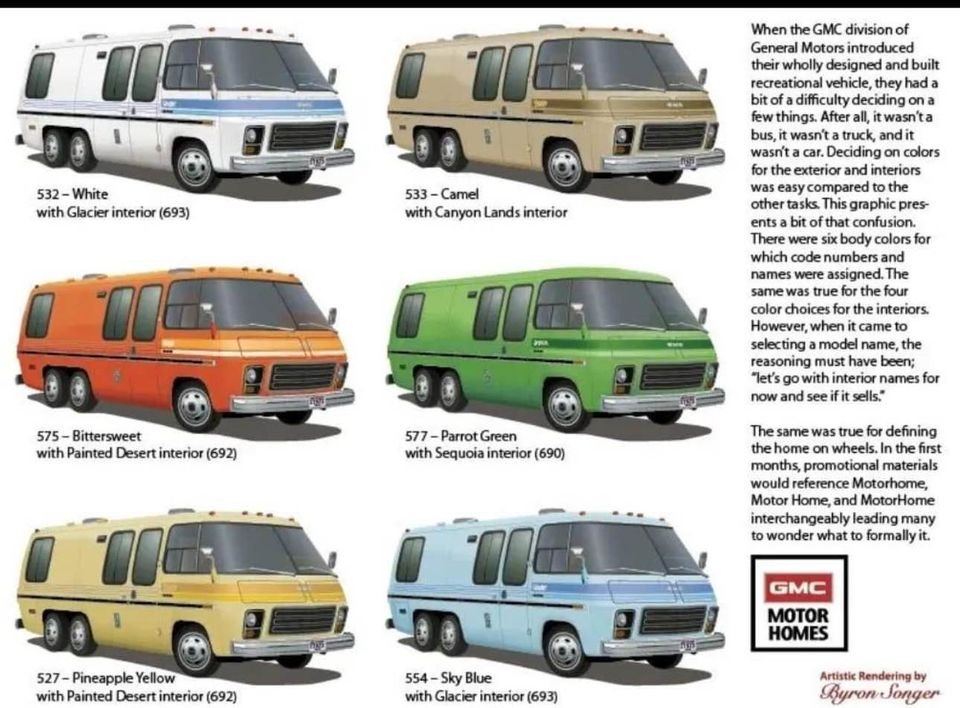 Check out this Painted Desert GMC Motor home for sale by owner for $25k. For the 1973 and 1974 model years, GMC gave its motorhomes names based on U.S. National Parks and natural landmarks — one of which was “Painted Desert.” These names didn’t denote mechanical differences but rather interior décor themes and trim packages with specific upholstery, fabrics, and color schemes. Other early trims included Canyon Lands, Glacier, and Sequoia.
