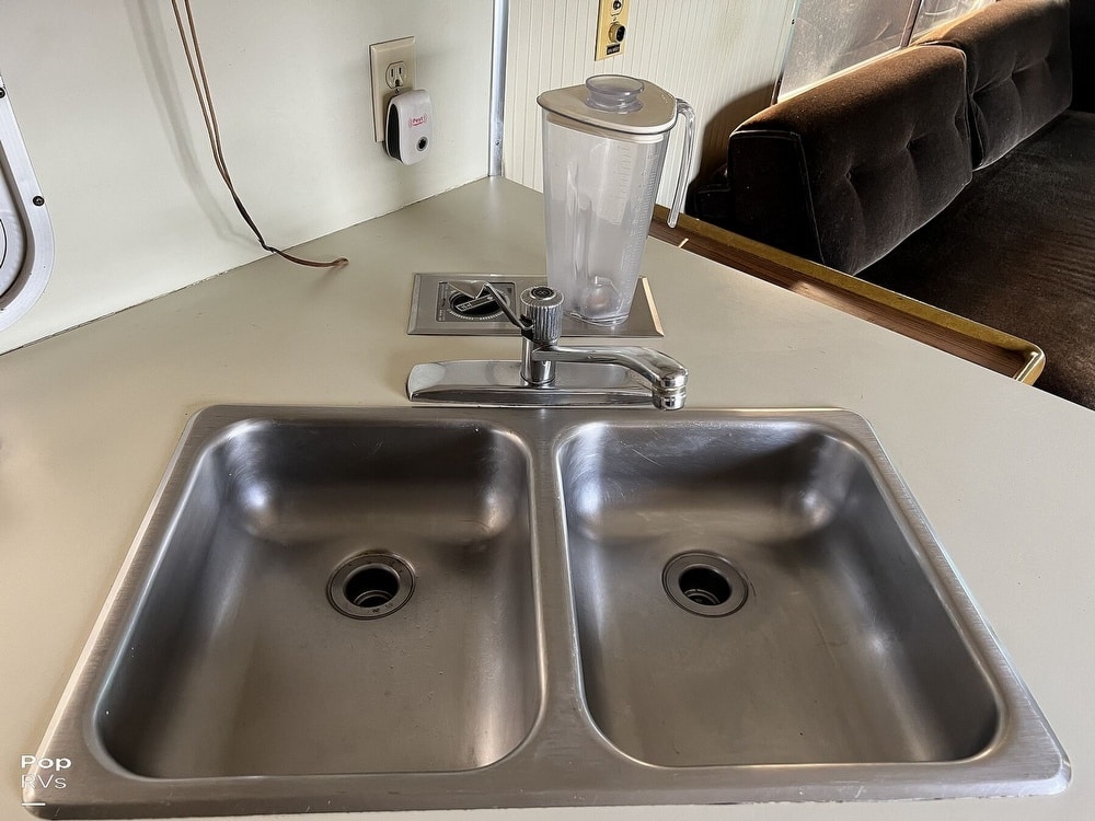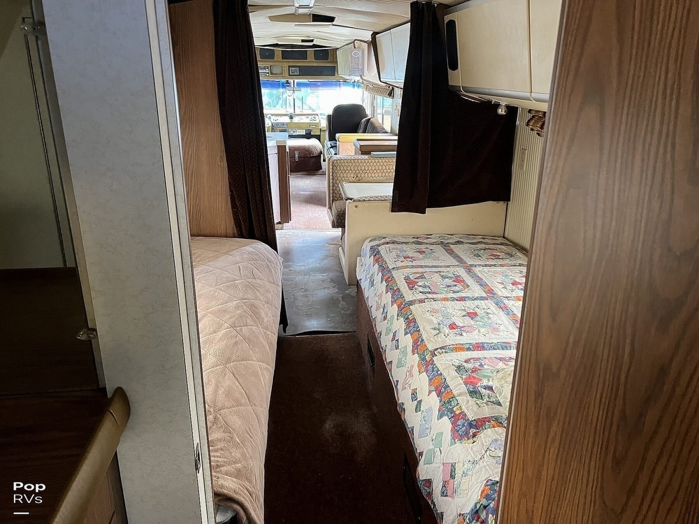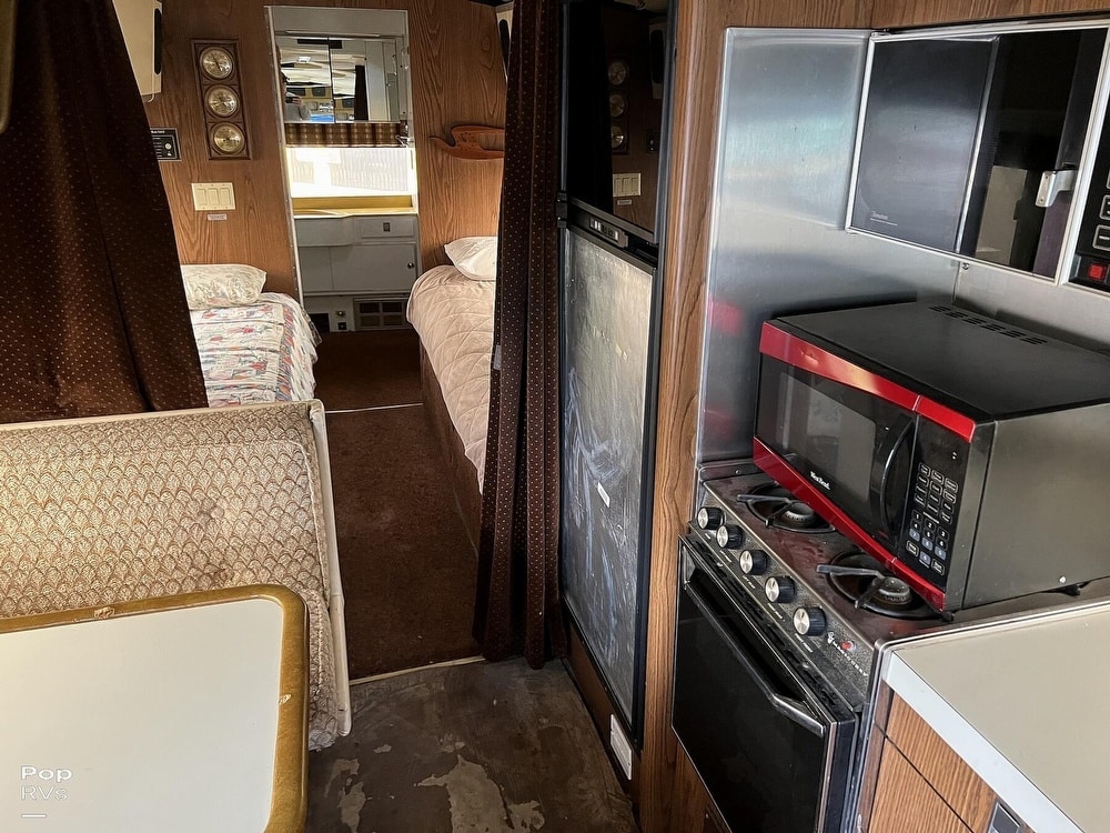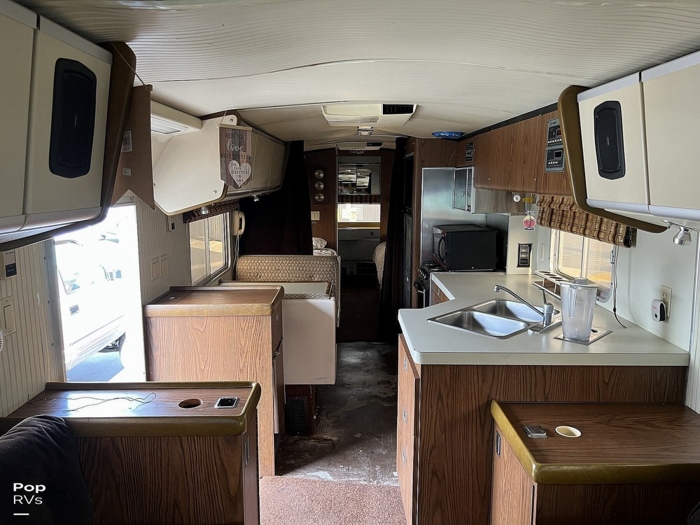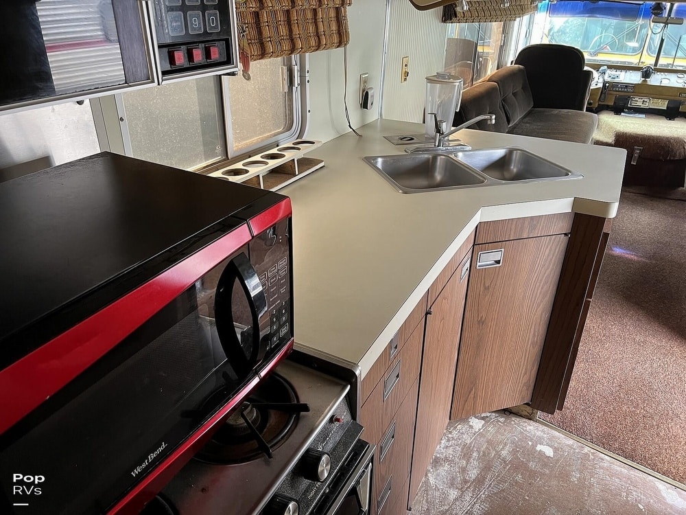 This coach has dual twin beds in the back and a large common area with a convertible sofa. Three air conditioners keep things cool inside. The galley offers a gas stove and oven, and the original built-in blender still works!