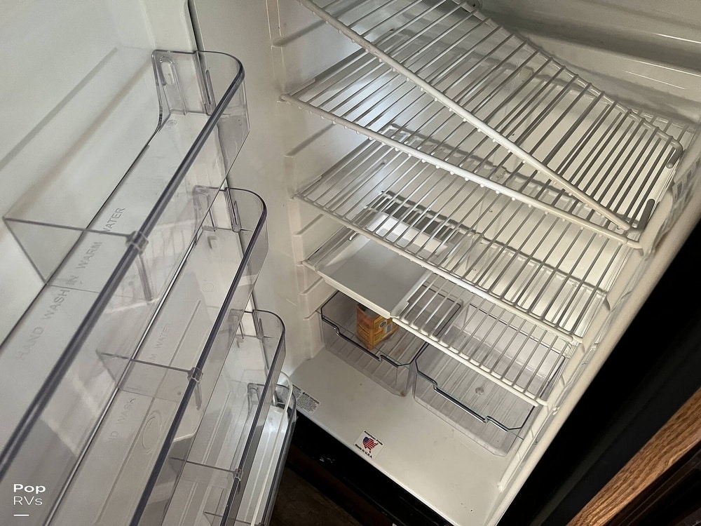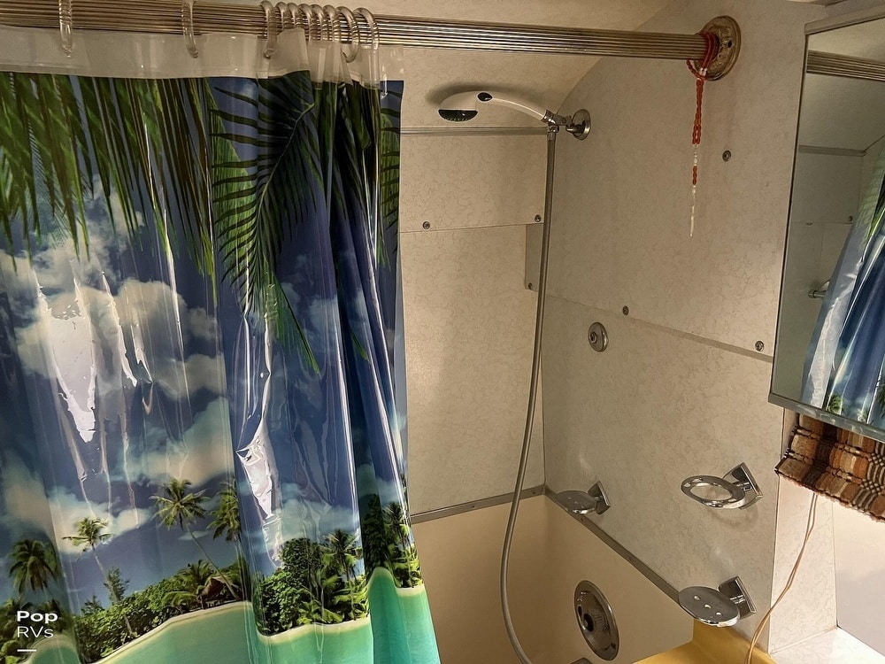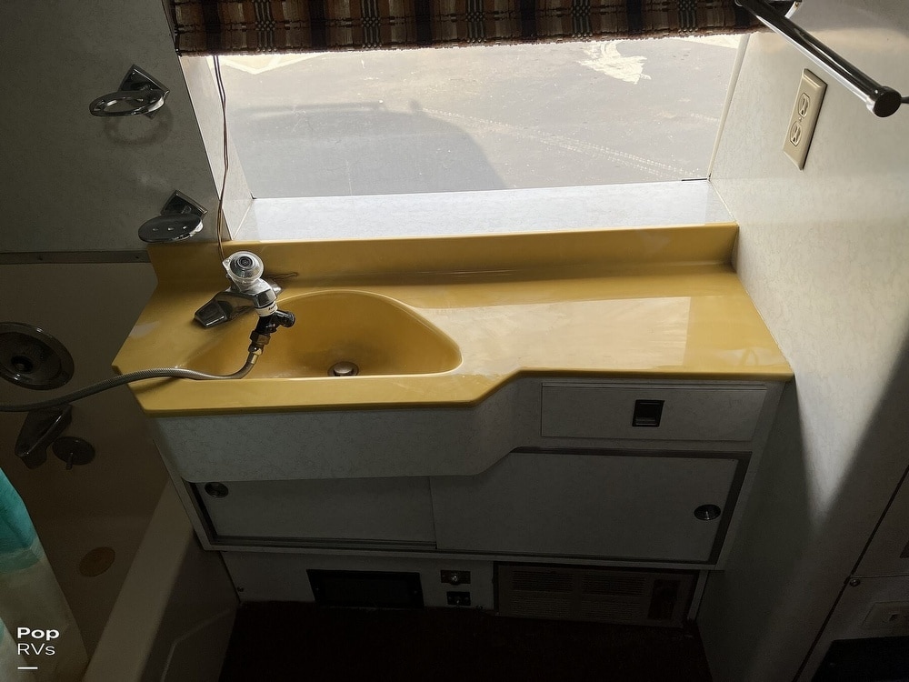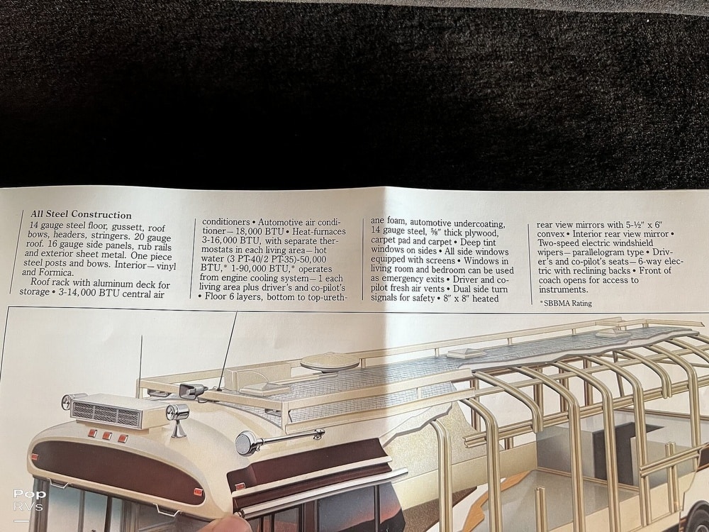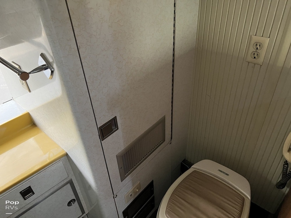 This coach has dual twin beds in the back and a large common area with a convertible sofa. Three air conditioners keep things cool inside. The galley offers a gas stove and oven, and the original built-in blender still works!
