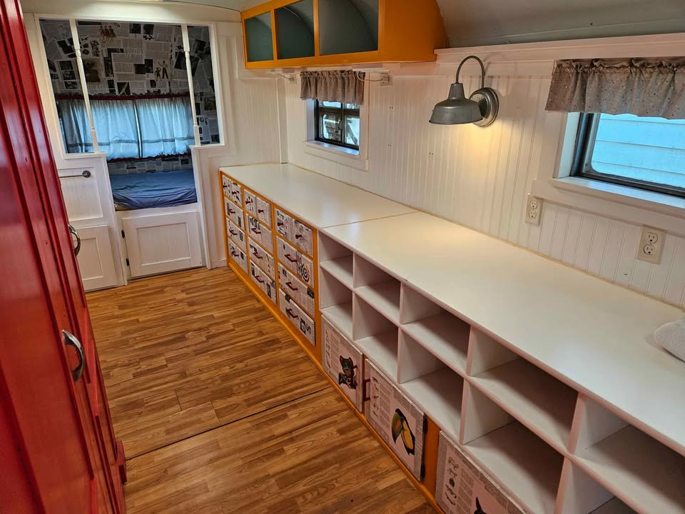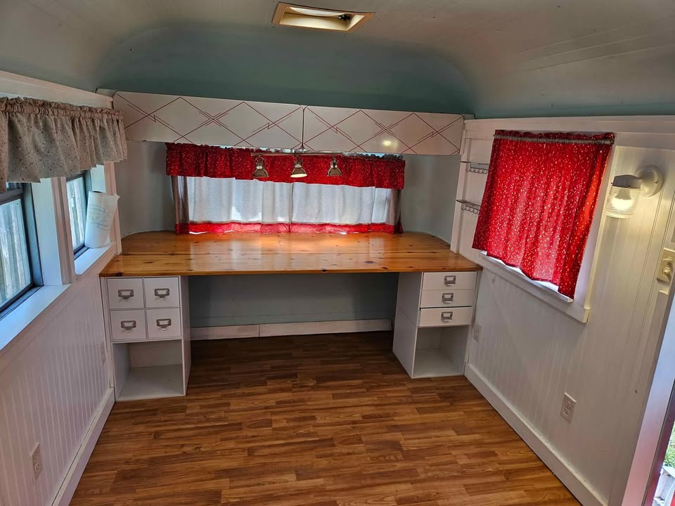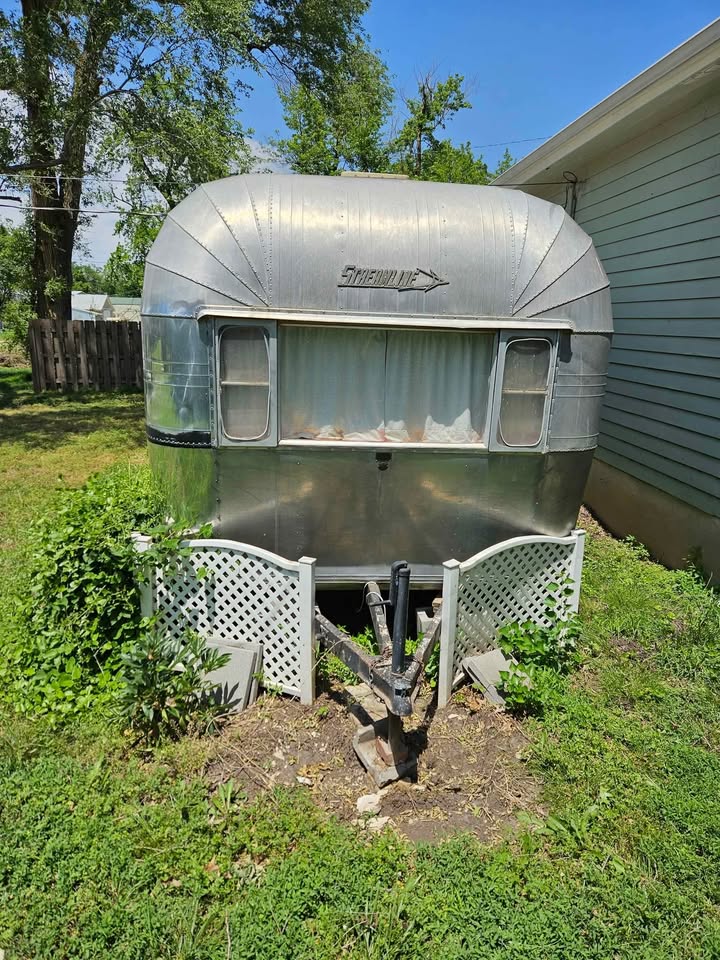 32′ Streamline crafting/hobby trailer. Late 50’s early 60’s model. Redone interior set up for my wife to craft in. Needs a little work on some windows. Comes with some items to help with that. Has a breaker box to wire directly to the house. Tv and bed in rear, built in cabinets and table.