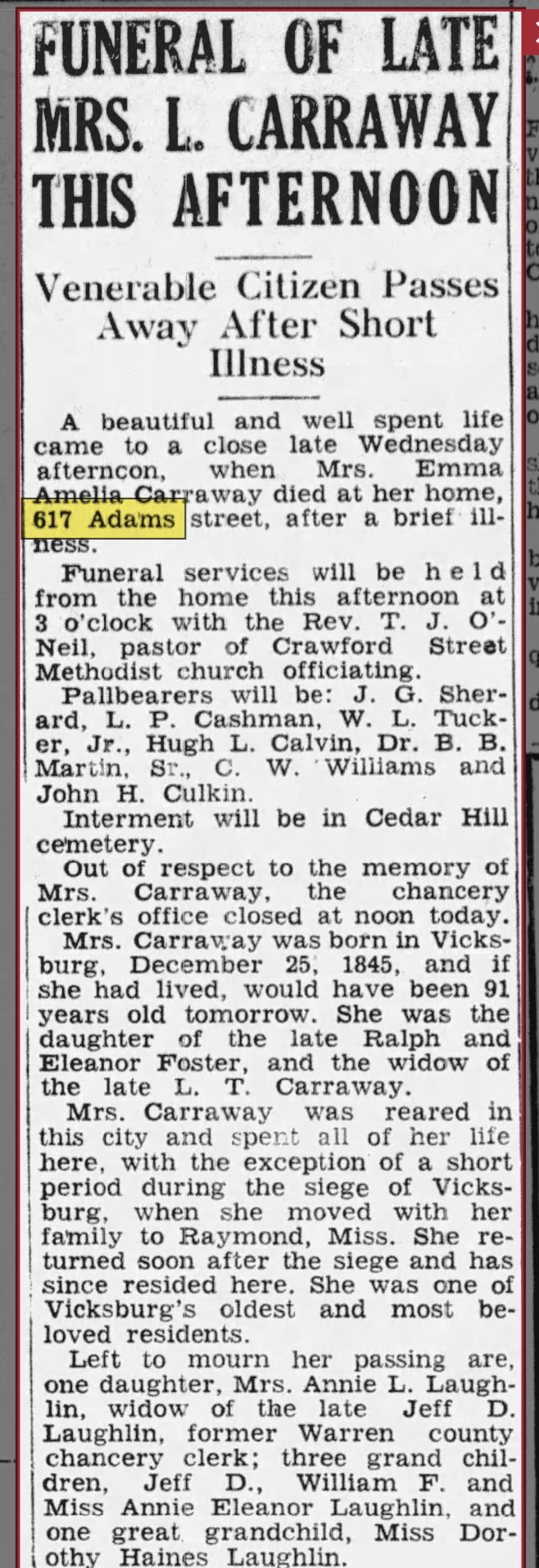 Below is the obituary for Annie’s mother, Emma. Emma was a seamstress who became a widow before she was 50. She lived in Vicksburg for her whole life except for a brief period during the siege of Vicksburg during the US Civil War.
