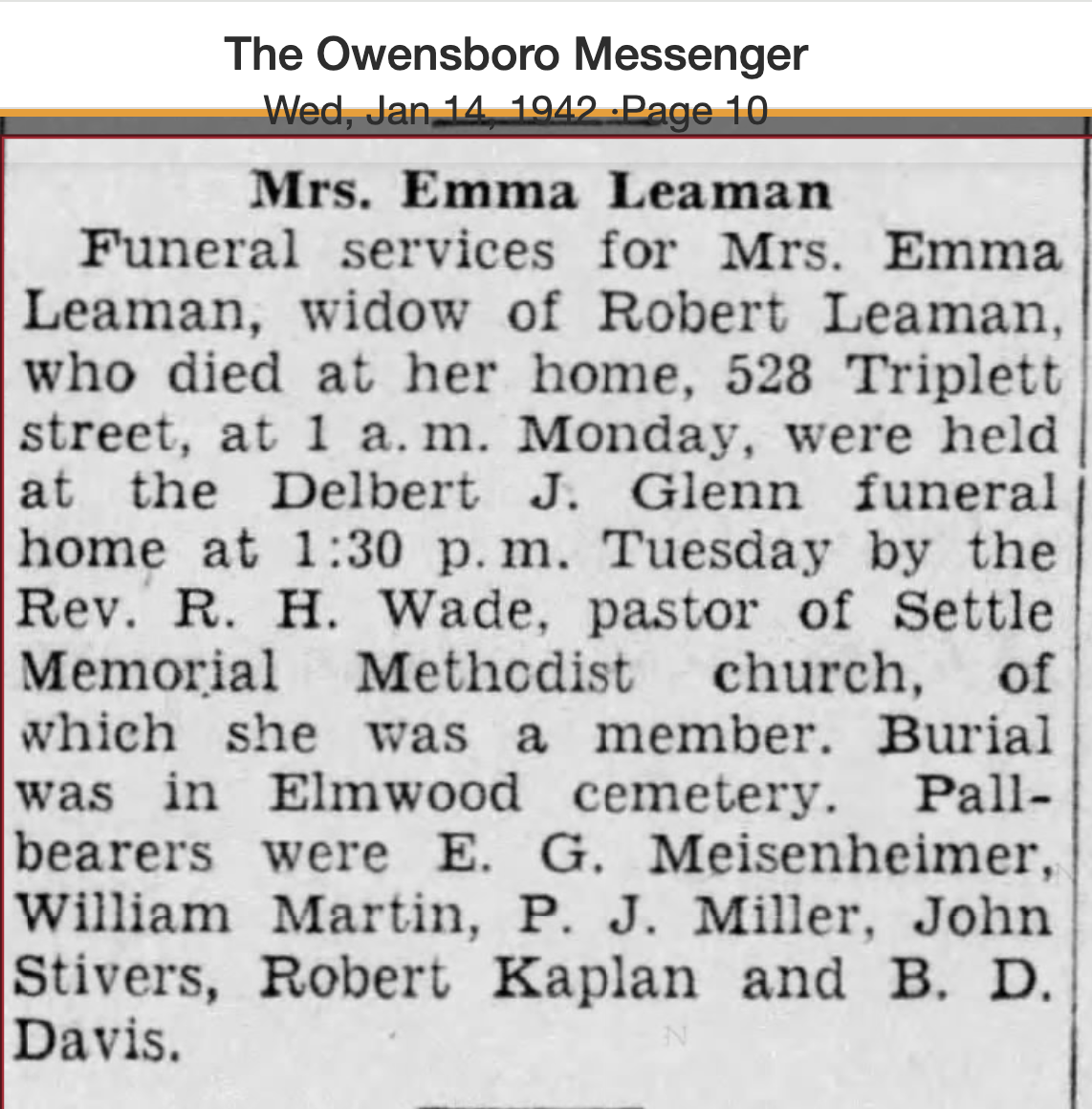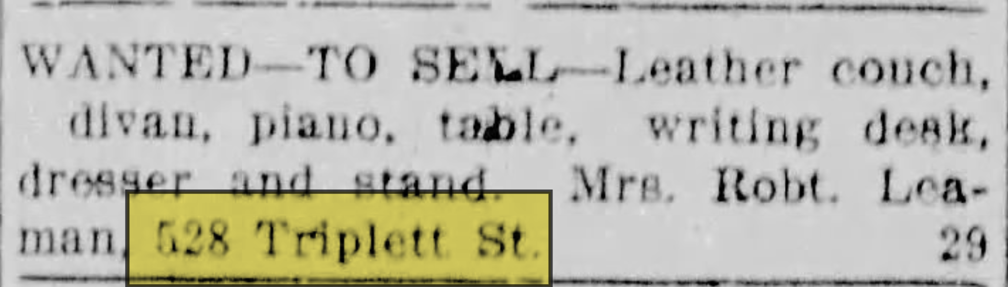 This was the home of Robert Leaman (b.1851) and his wife, Emma (1857-1942). Robert owned a grocery store. The couple lived in the home with their two daughters, Cora and Dora, for at least four decades.