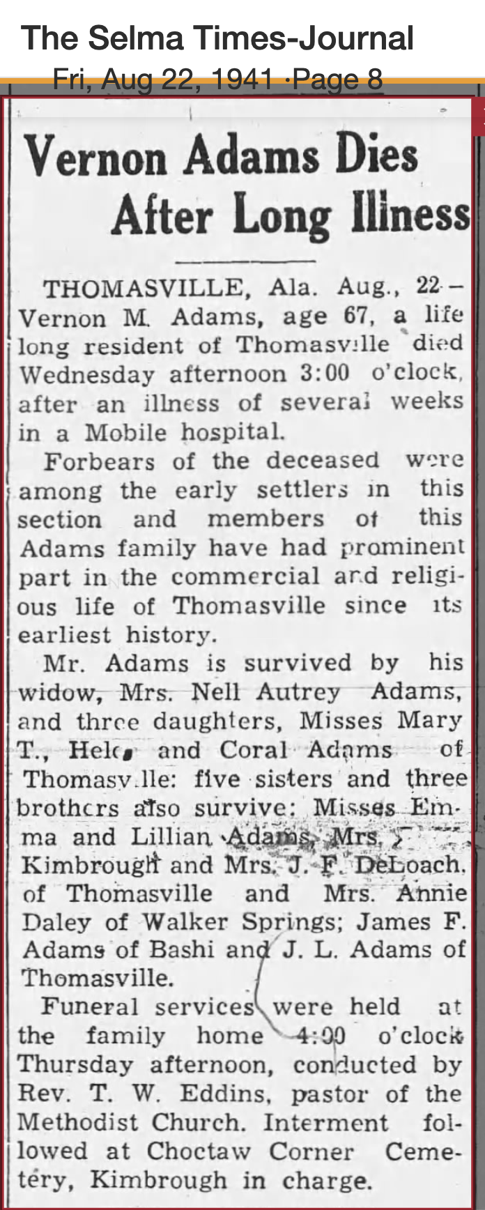 This was the long-time home of the Adams Family. In 1917, when Vernon Monroe Adams Sr. (1874-1941) was 46, he married 17-year-old Nell Autry Adams (1899-1999). The couple had three daughters, Mary, Helen and Coral, and a son, Vernon Jr, who died at age one. Vernon Sr. was a cattle dealer and farmer, and Nell was an accomplished seamstress. She died at age 100 in a nursing home.