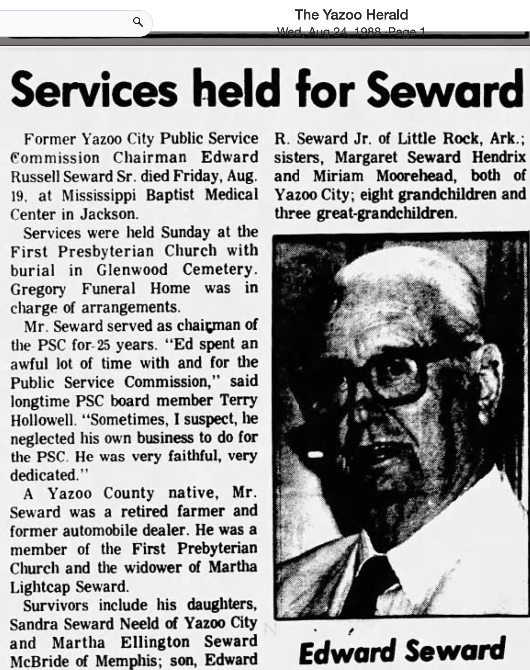 When Edward Russell Seward purchased this home in the 1930s, he owned a cotton farming operation. He married lovely Martha Lightcap in 1932, and the couple raised their children, Sandra, Martha and Edward, in this home. Mr. Seward later owned an automobile dealership, and for 25 years served as Yazoo City Public Service Commission Chairman.