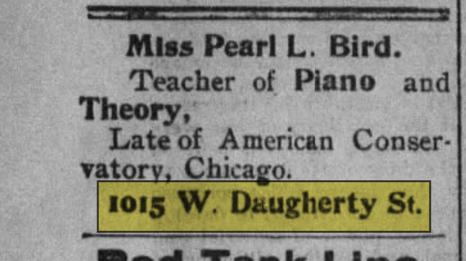 In the early 1900s, Miss Pearl L. Bird, a music teacher of piano and theory, gave piano lessons out of this home.