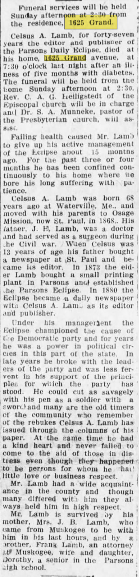 This was the home of Celsus Lamb (1860-1922). He lived in this home with his wife, Mary, and daughter, Dorothy. Mr. Lamb was the editor and publisher of the Parson Daily Eclipse for 47 years. Born in Maine, his family moved to the mid-west in 1868 after his father served as a surgeon in the Civil War. The elder Mr. Lamb bought a printing plant in Parsons, and in 1880 the Parsons Daily Eclipse became a daily newspaper with Celsus as editor and publisher. Celsus was known as a kind-hearted man. He died in the home of diabetes in 1922.