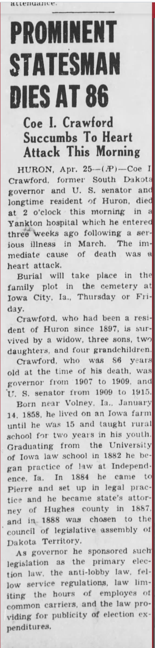 This was the home of Coe I. Crawford (1858-1944). Mr. Crawford was a lawyer, governor of South Dakota from 1907-1909, and U.S. Senator from 1909-1915.