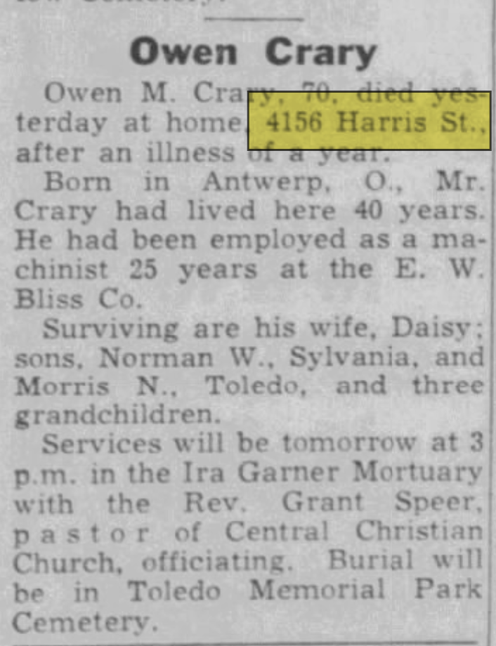 Owen M. Crary purchased this home in the mid 1930s with his wife Daisy. With an eighth grade education he was able to buy a home, support his wife and sons, Norman, Sylvania, and Morris, as a machinist at the E.W. Bliss Company, a manufacturer of machine tools.