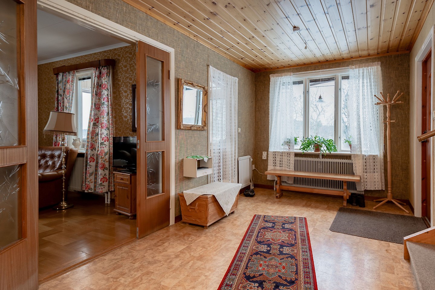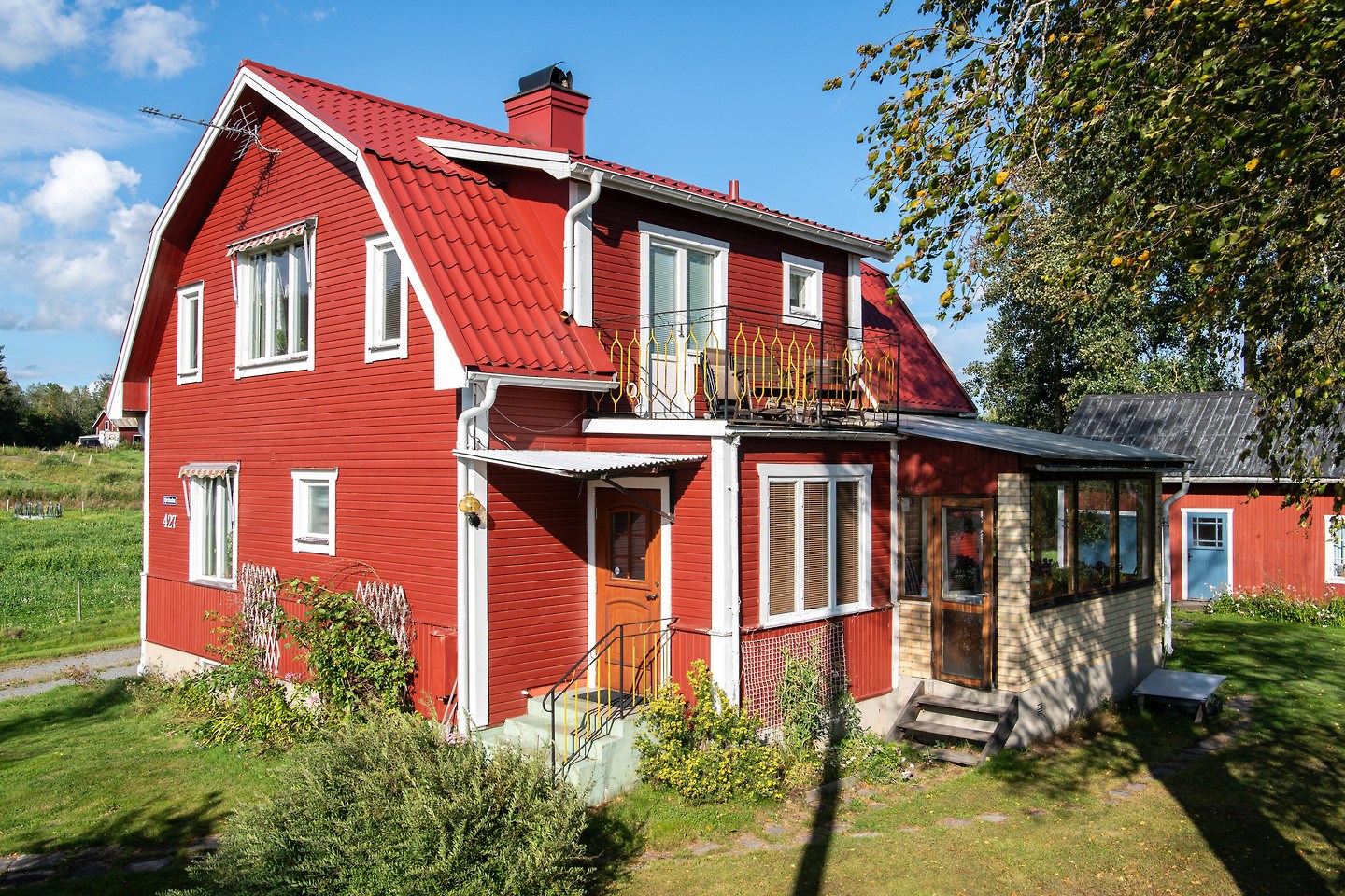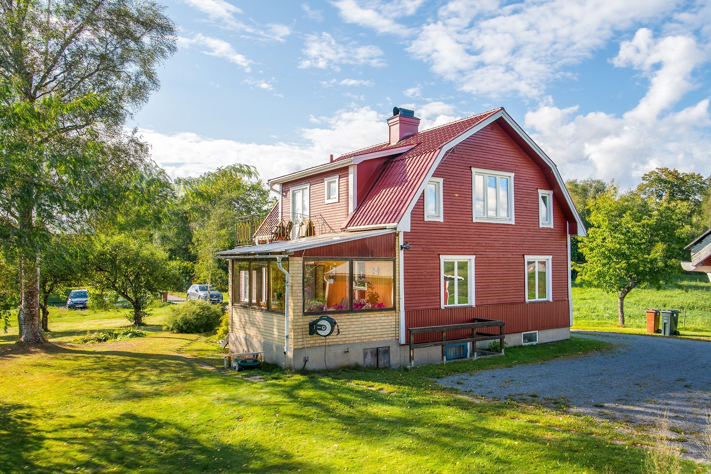 Two garages and a farmhouse! This c.1937 farmhouse for sale in Sweden has a large hall, kitchen with dining area, toilet, dining room and living room on the entrance floor. On the upper floor there is a living room, a bedroom, alcove and shower room. Good storage space in the basement. Glazed conservatory with a nice view. Large garden in a sunny south-facing position with an open view of lush pasture.