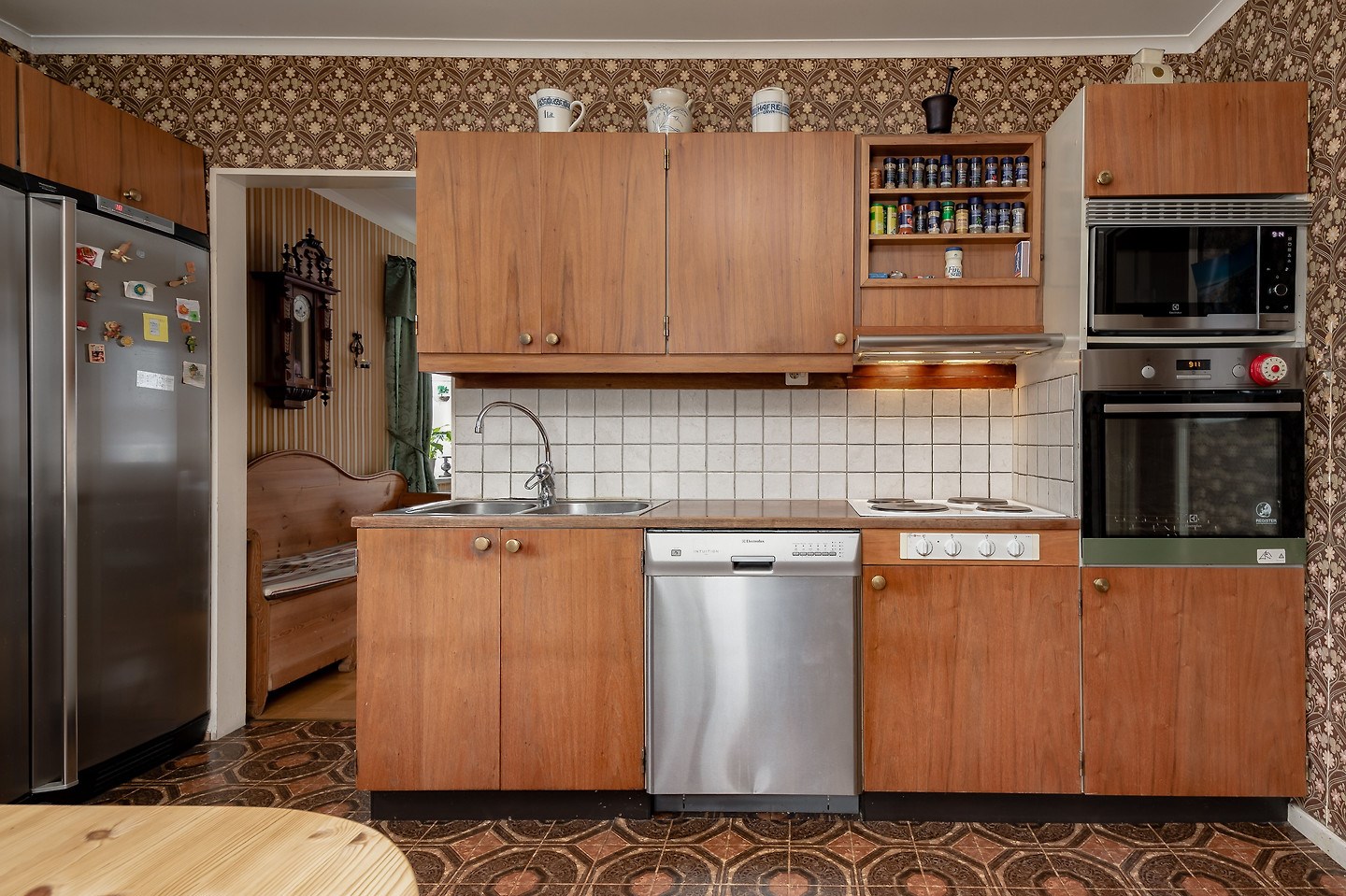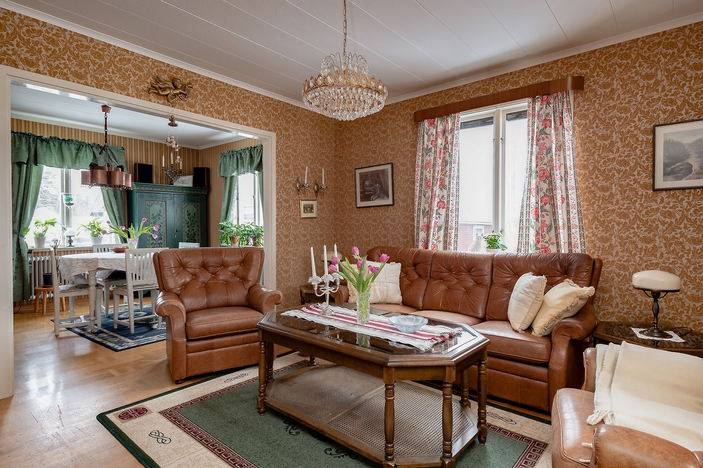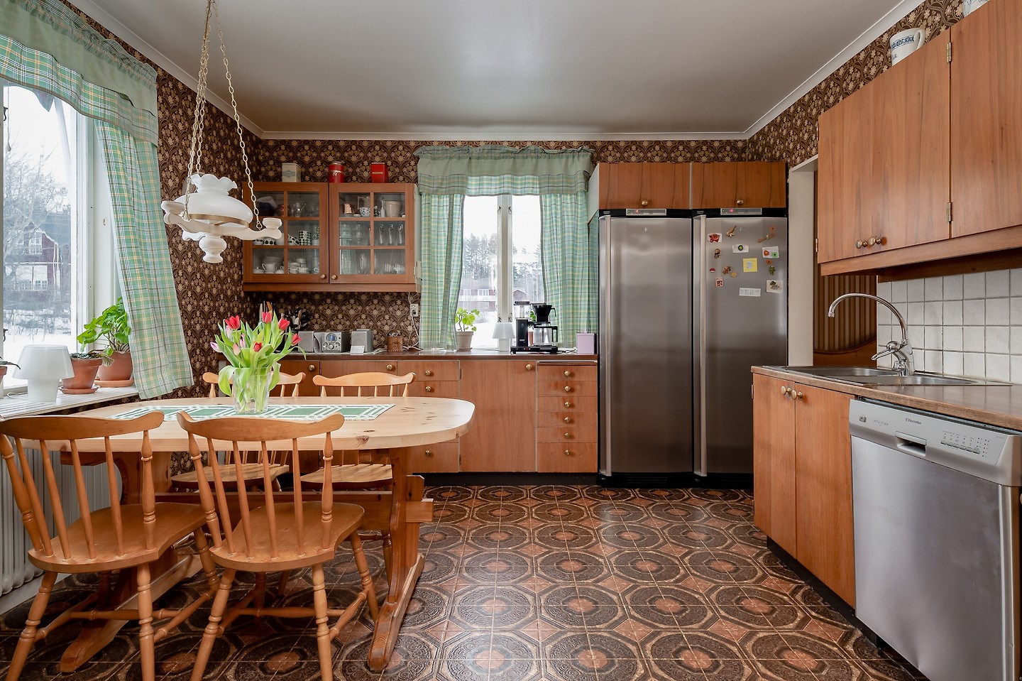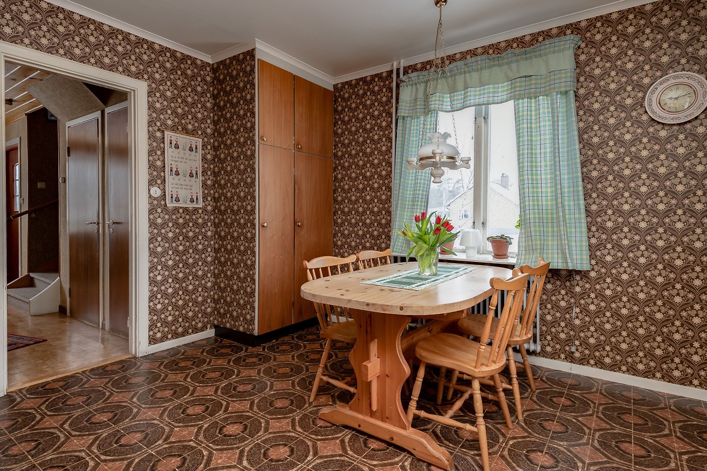 Two garages and a farmhouse! This c.1937 farmhouse for sale in Sweden has a large hall, kitchen with dining area, toilet, dining room and living room on the entrance floor. On the upper floor there is a living room, a bedroom, alcove and shower room. Good storage space in the basement. Glazed conservatory with a nice view. Large garden in a sunny south-facing position with an open view of lush pasture.