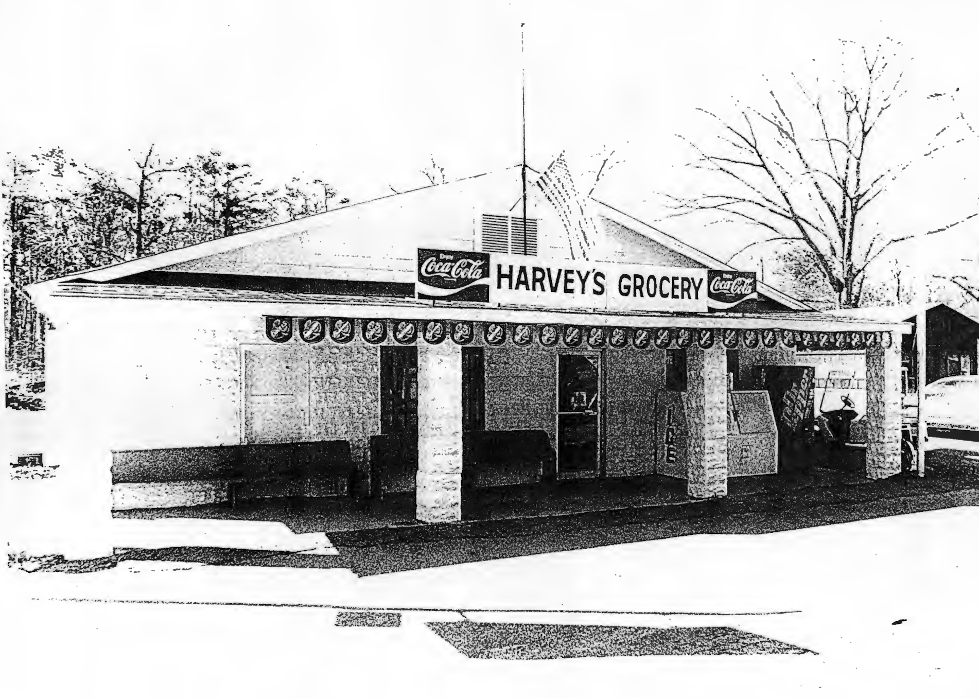 This house, known as the Harveyville House, is located opposite Harvey’s Grocery and Texaco Station and appears to have been the home of Henry Harvey (1886-1955). Situated about three miles west of Camden, Arkansas, this historic general store was established by Henry Harvey in 1941. The building was reconstructed in 1948 to replace the log building which had become too small. It served as a campaign stop for notable politicians, including Bill Clinton. The general store and restaurant was operated by Henry Harvey’s grandson, Bobby Hildebrand, as late as 2002 or so. It was added to the National Register of Historic Places in 2001 and is no longer in business.