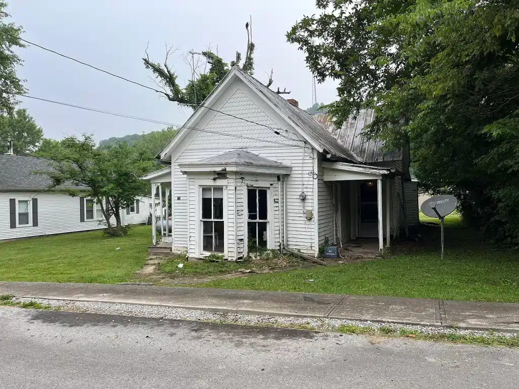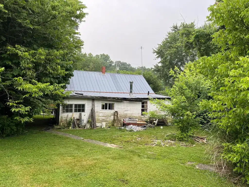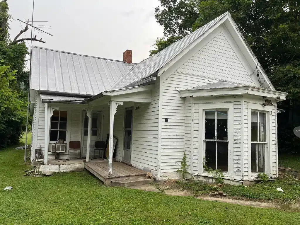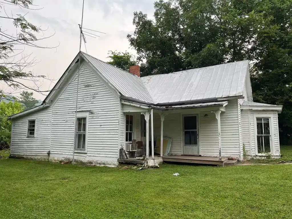 Here is a cheap old house in Kentucky with one bedroom, one bath, tin roof, imbricated shingles and fireplace.