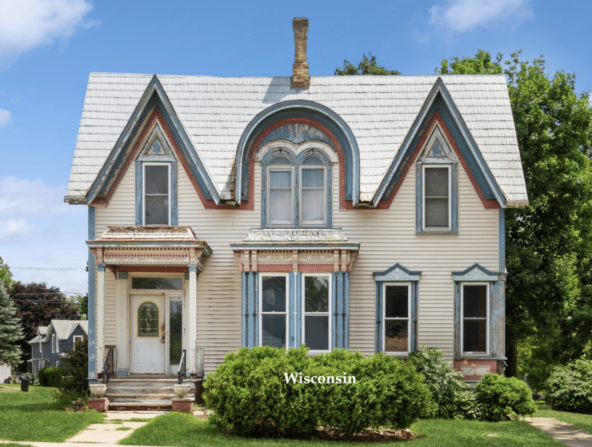 This wonderful, quirky Italianate home for sale in Wisconsin is the Judson Wright Residence built between 1884 and 1885. The Wisconsin Historical Society calls it an Italianate, (although I never would have guessed) and it features a pair of steeply pitched dormer gables with a center, round-arched dormer, built-ins and beautiful moldings and wainscoting. It is a multi-family home of 2,345 square feet.