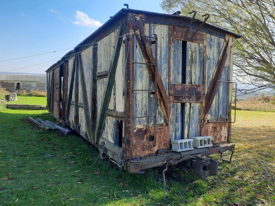 Don’t let the looks deceive you, this old thing is solid yet. Built in 1913 by the Pressed Steel Car Co of McKees Rocks for the PRR as the new standard 40′ boxcar, known as the X23. It could become an interesting she shed or guest house.