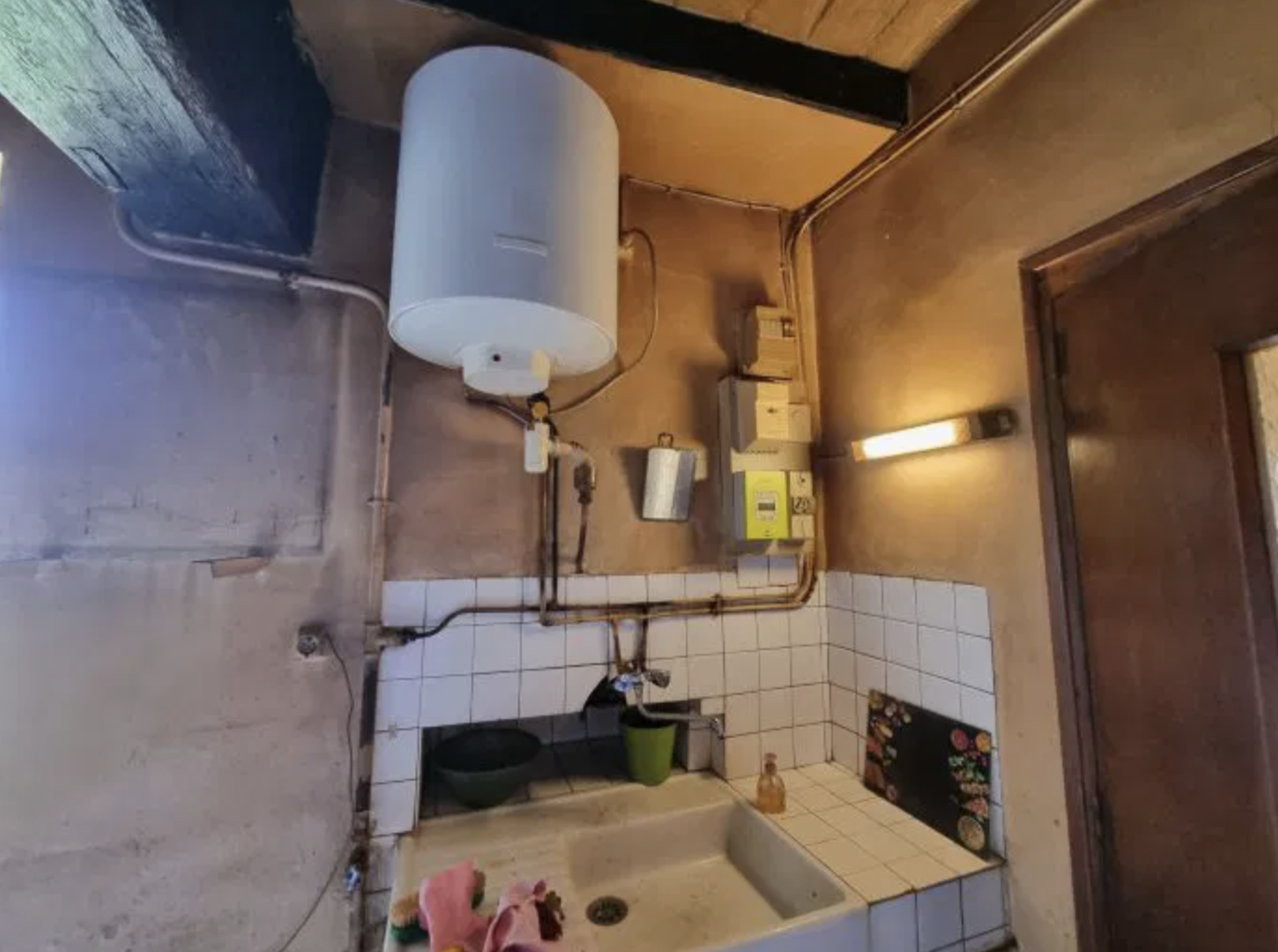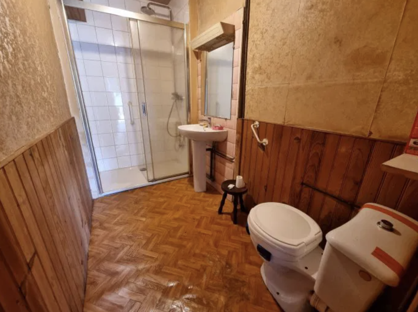 The entrance opens into a hallway with a sitting room to the left which has an open fireplace. Immediately in front is a shower room with sink and WC, and to the right an exceptionally large kitchen / dining / living room with an open fireplace and exposed beams. This room has a door to another space which would make an ideal laundry room or pantry.