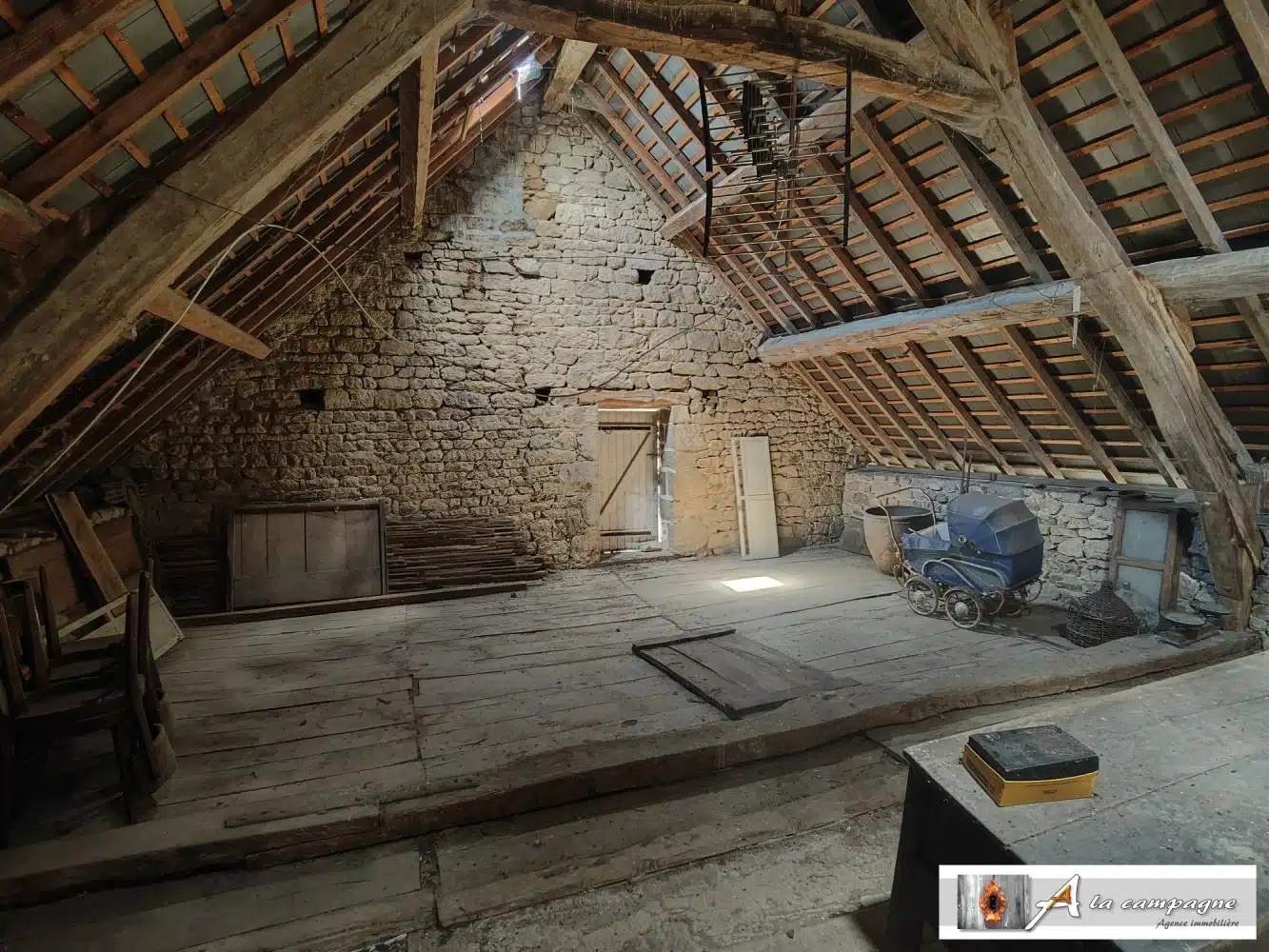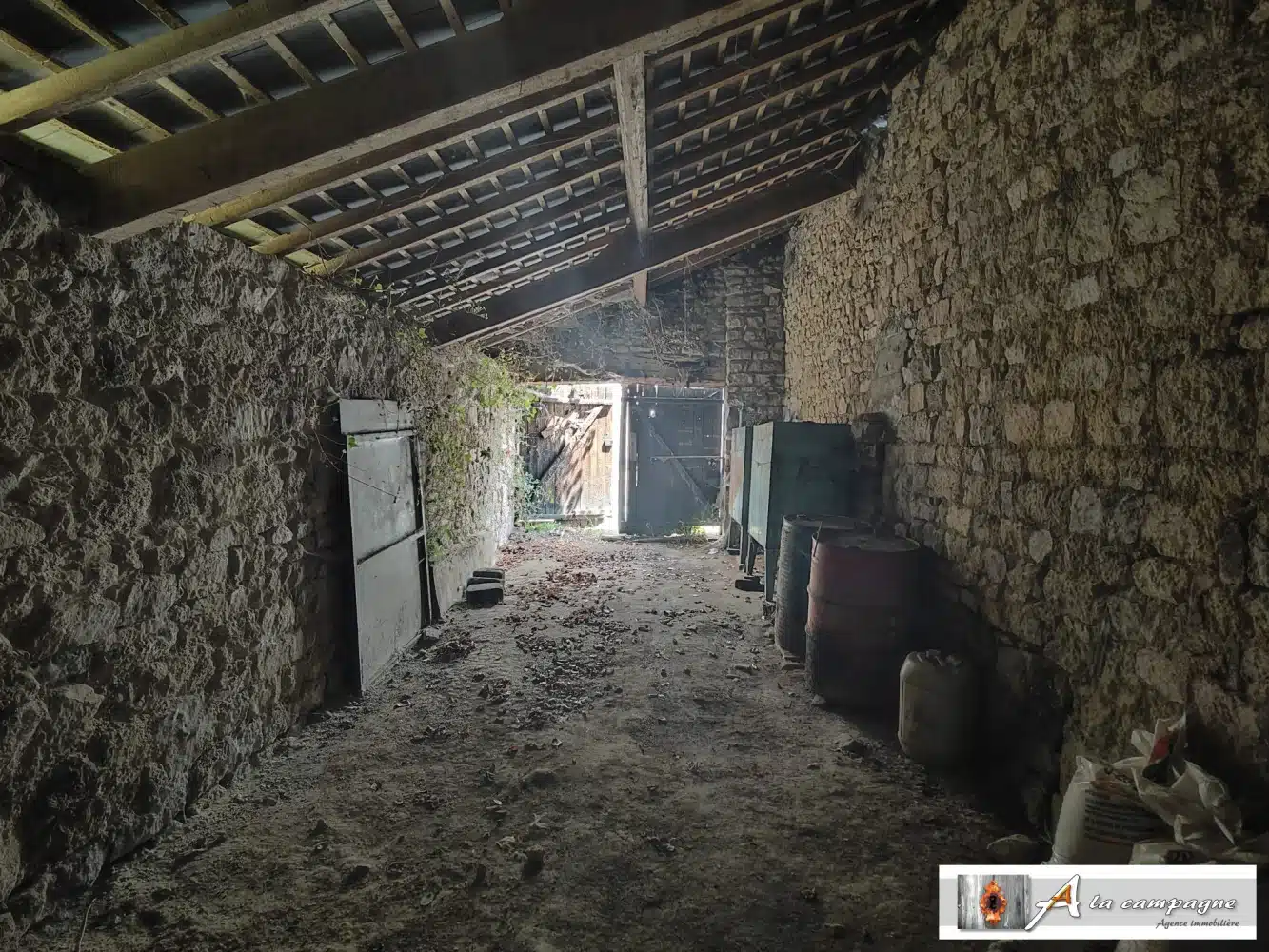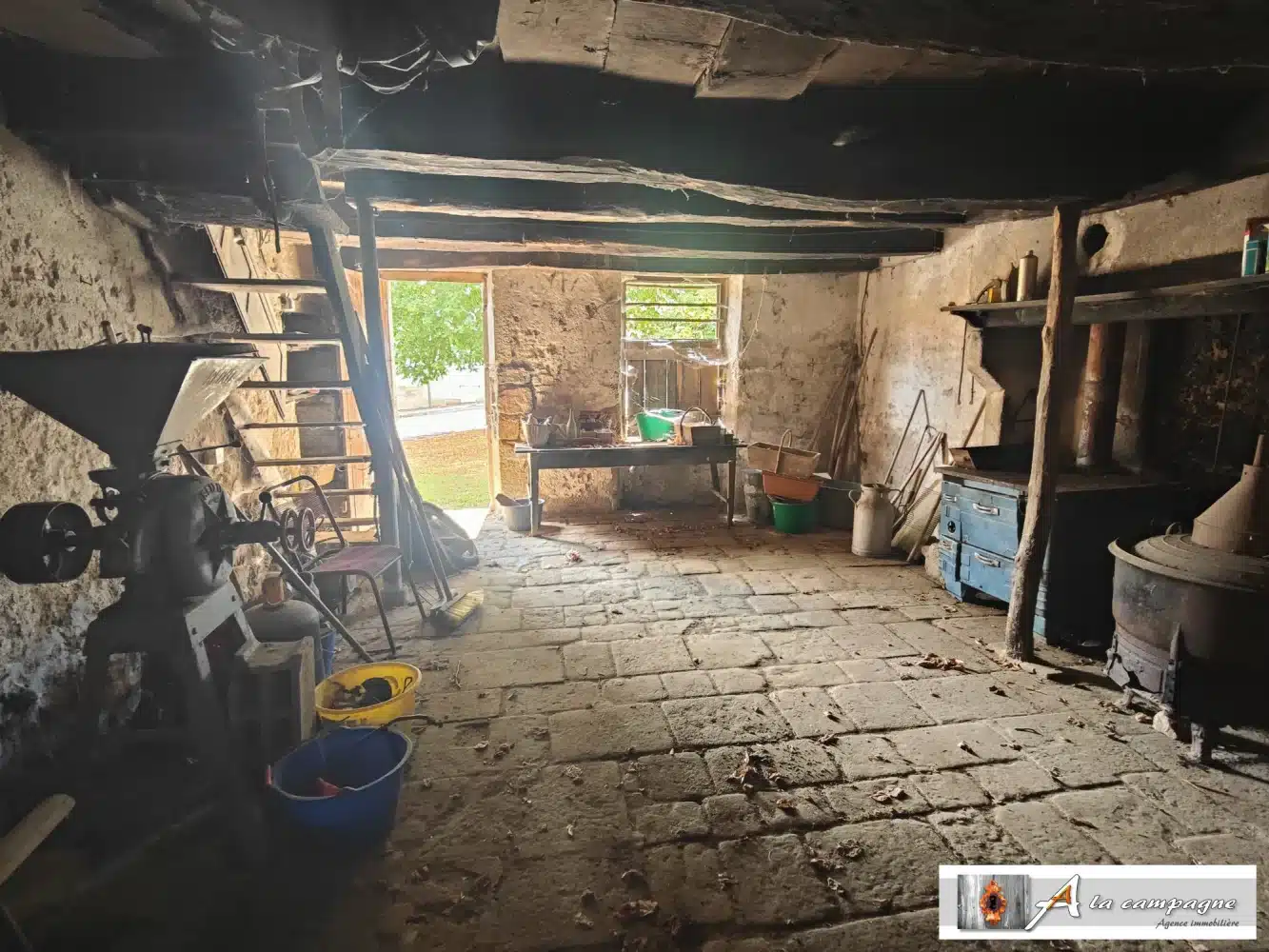 The detached stone house for sale in France comprises, on the ground floor, an entrance hall, a kitchen with a wood-burning stove on the left, and a living room on the right, opening onto a beautiful vaulted cellar.