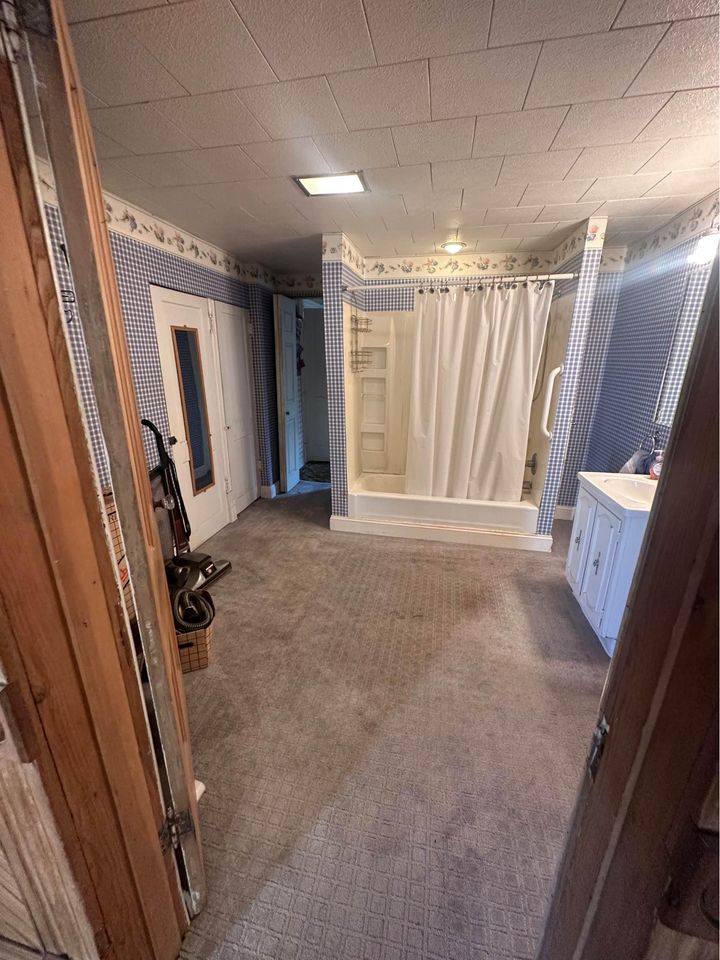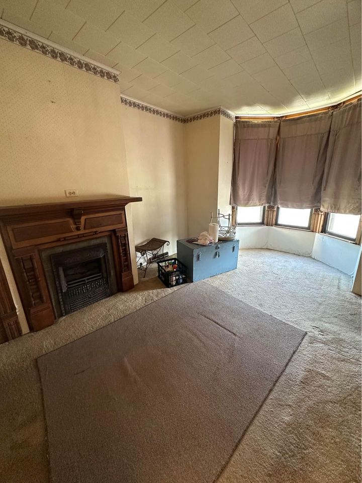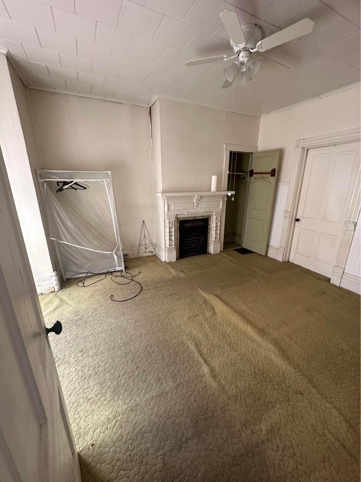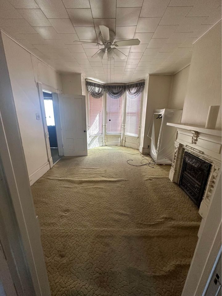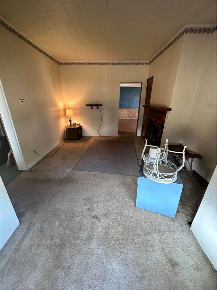 Four bedroom, one bath cheap house with a mini tower and beautiful fireplace mantels.