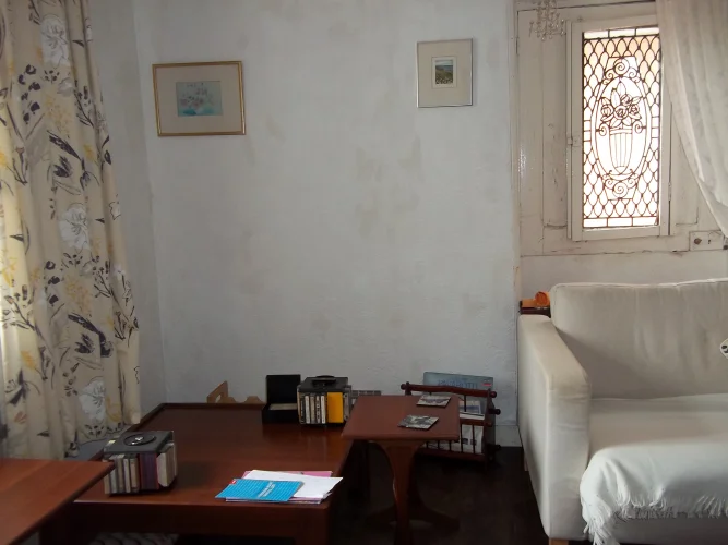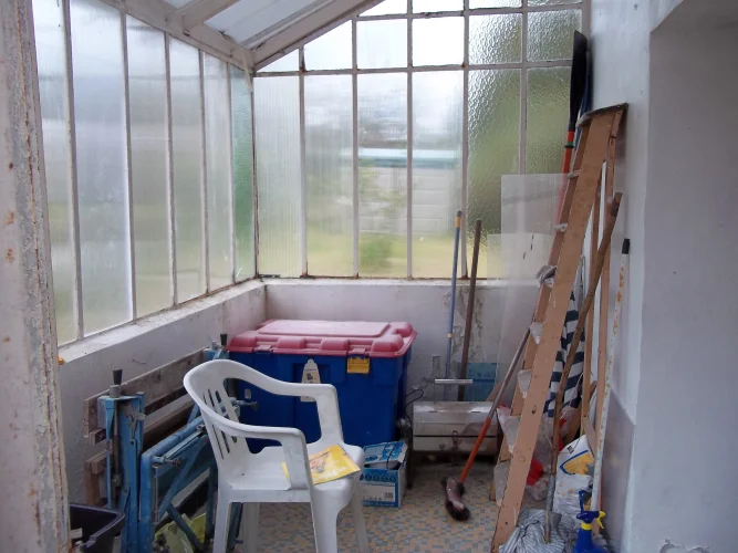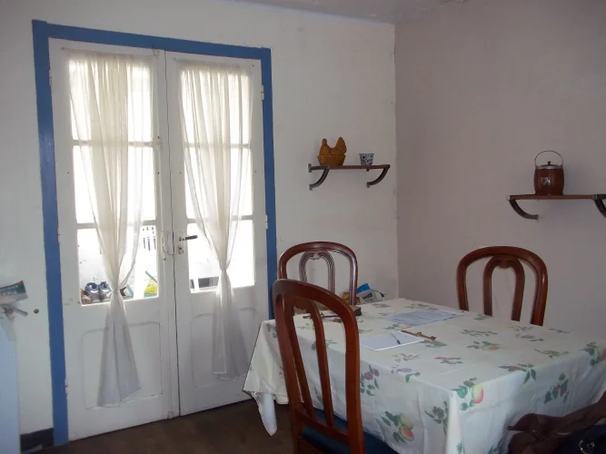 On the ground floor is a large entrance, on one side the kitchen/dining, it is basic but functional, a bright room with a door in the back which gives access to a small conservatory to renovate and to the garden.