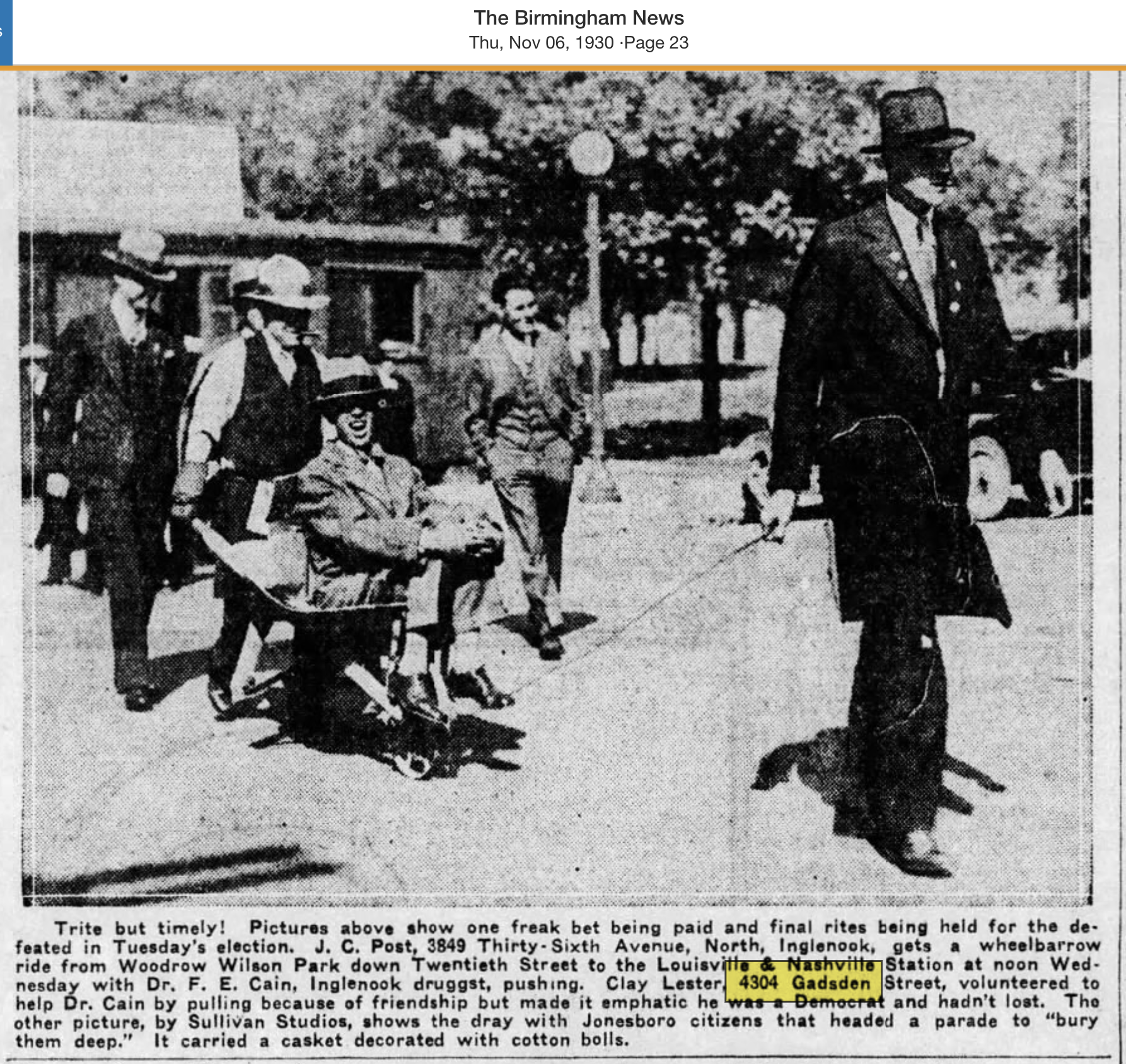 In the 1930s this was the home of Clay Lester (tall man pulling the wheelbarrow). He was a yard man for the Louisville and Nashville Railroad. He lived in the home with his wife Eleanor, and children Milton, Juanita and Carolyn.