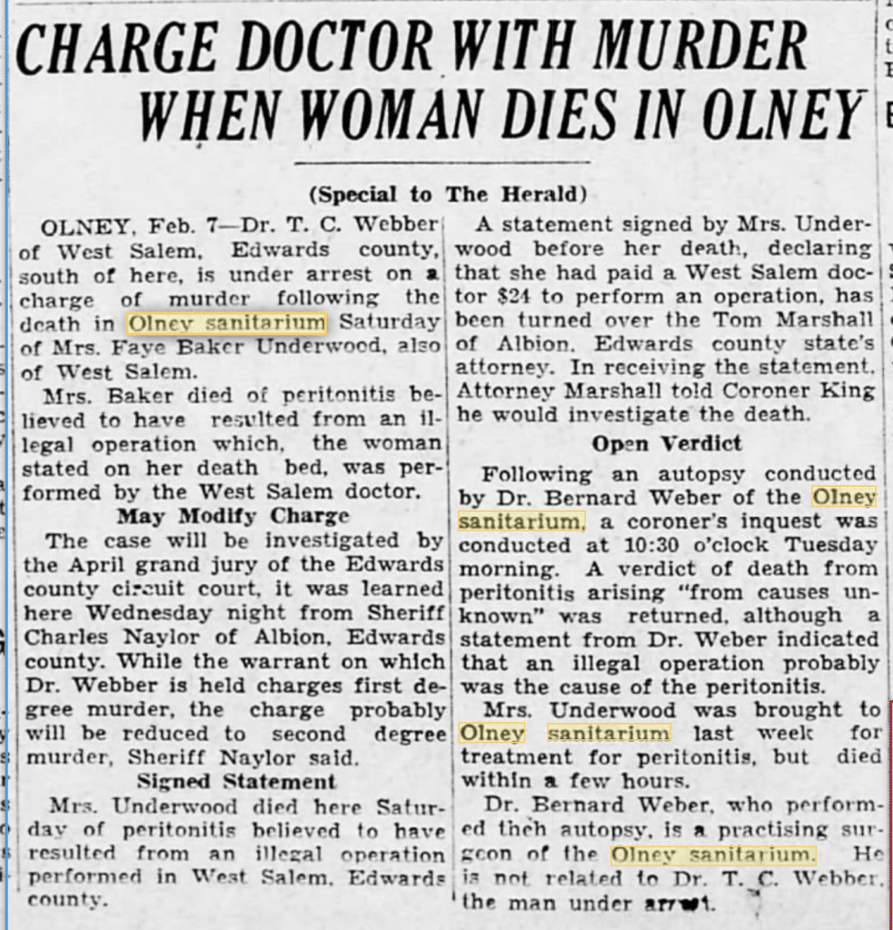 Before Dr. George T. Weber, founder of Olney Sanitarium, purchased the building in 1898, the building was the Arlington Hotel, known as the finest hotel in the area. As a sanitarium, the facility was primarily known for its excellent medical service. Many babies began life at the medical facility, and thousands of life-saving surgeries were performed there. The hospital did, however, have a few scandals. In 1929, Dr. T.S. Weber, not to be confused with Dr. George Weber, was charged with murder for performing an illegal operation. In addition, the “demented” Mrs. Lola Hough, admitted for psychiatric reasons, jumped from a third floor window and died from her injuries.