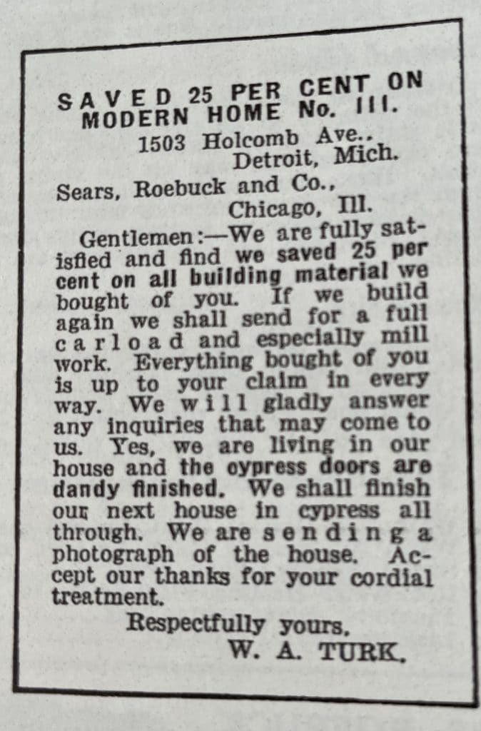 After W.A. Turk built his Sears kit house, Modern Home No. 111, he wrote a letter to the company expressing his pleasure.