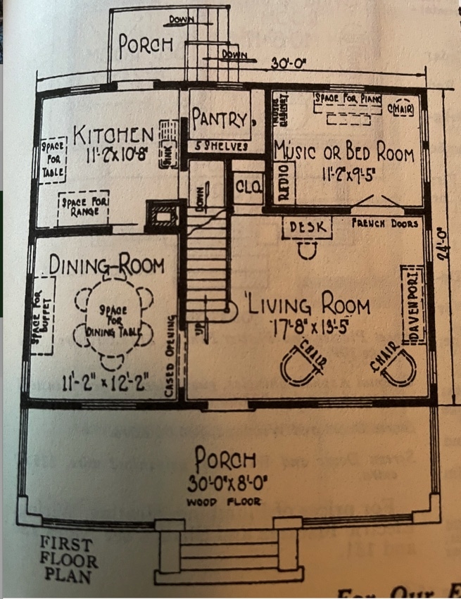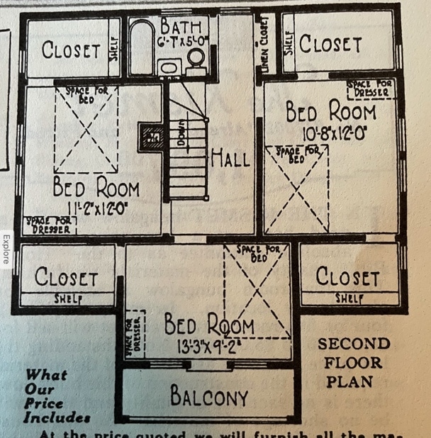 The Westly was one of Sears most popular designs. You have to admit that it oozes curb appeal with its Juliette balcony, large eave brackets and porch columns on brick piers. The design almost looks like a Swiss chalet. It featured a broad front porch, large 17′ x 13′ living room with fireplace, nine-foot ceilings on the first floor, dining room with built-in buffet, a swinging door into the kitchen, and pantry. One bedroom was offered on the first floor with three bedrooms and a bath on the second level.