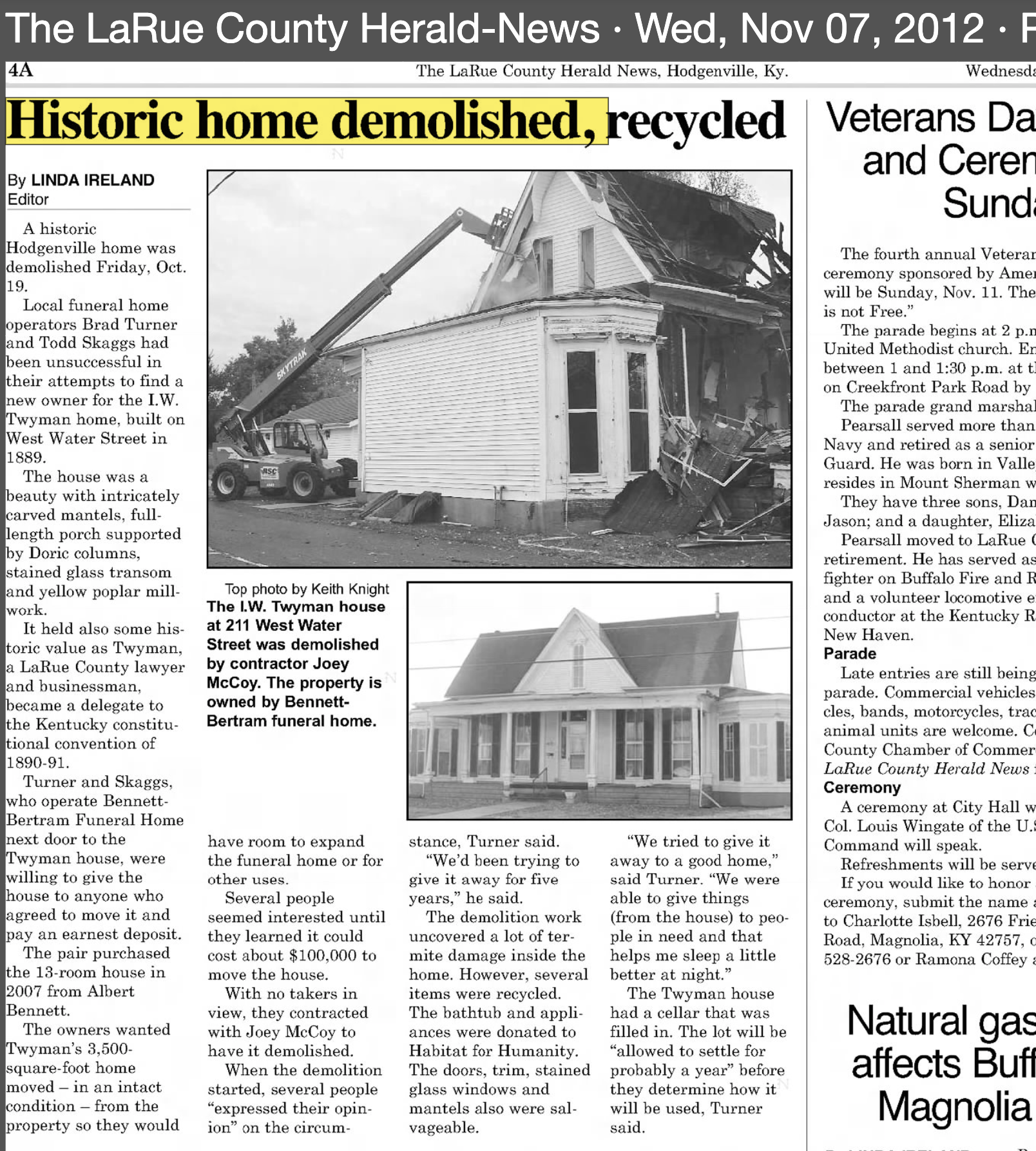Sometimes I just don’t understand American towns and their lackluster interest in historic preservation. The house below, the I.W. Twyman House of Hodgenville, Kentucky, was allowed to be demolished in 2012 to accommodate six or seven parking spaces for the funeral home next door. The house was a beauty with ornate fireplace mantels, porch with Doric columns, stained glass and yellow popular millwork. You can read its story in the newspaper article below.
