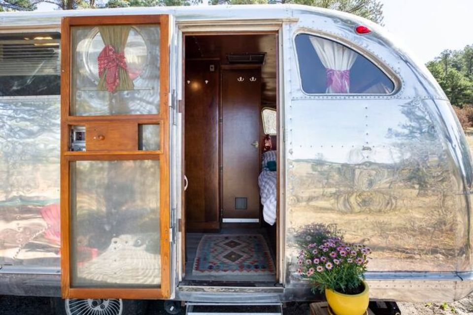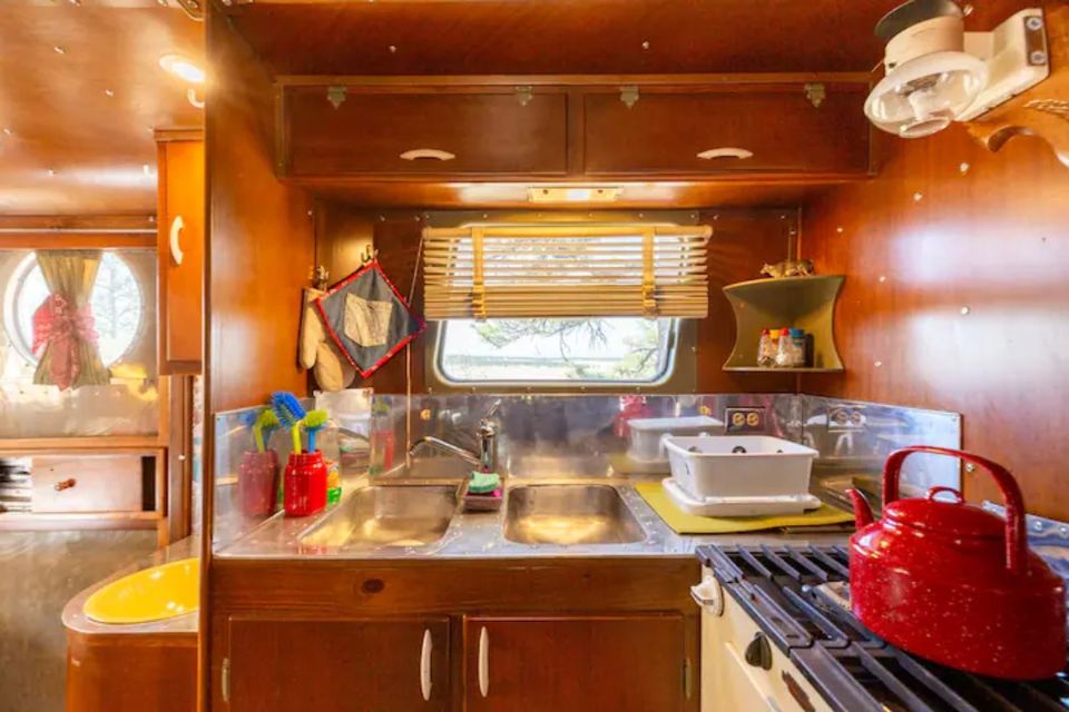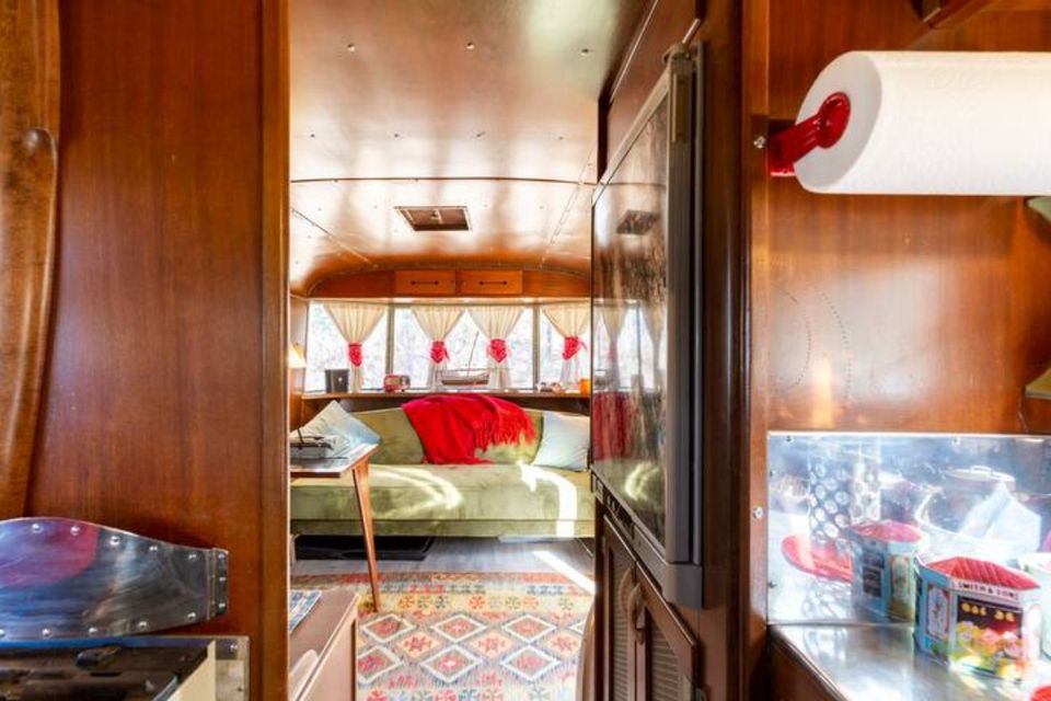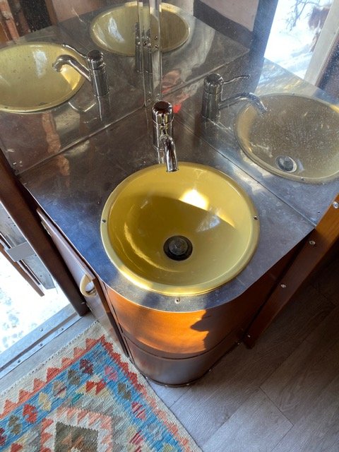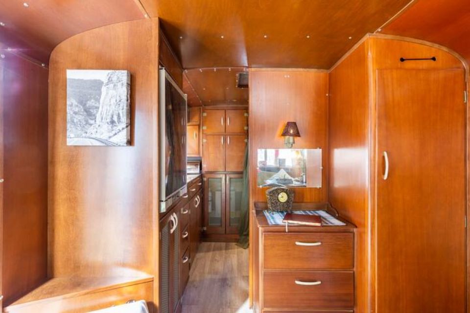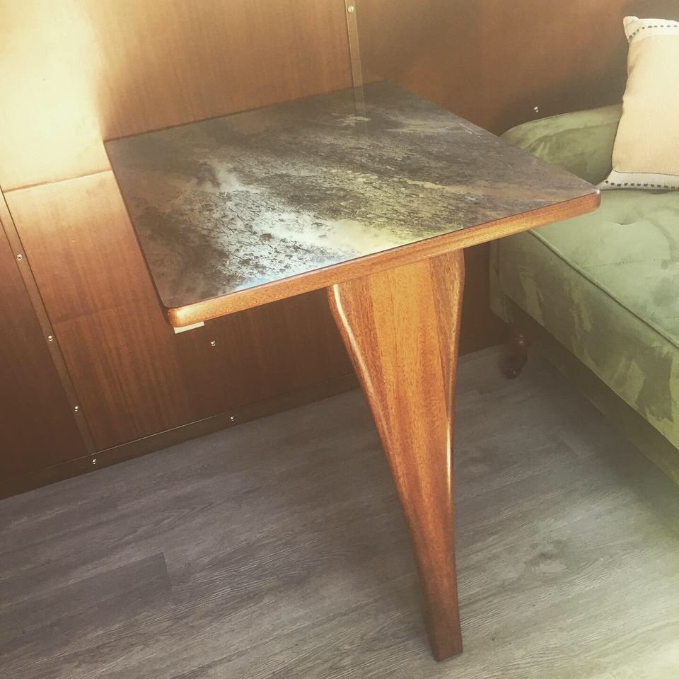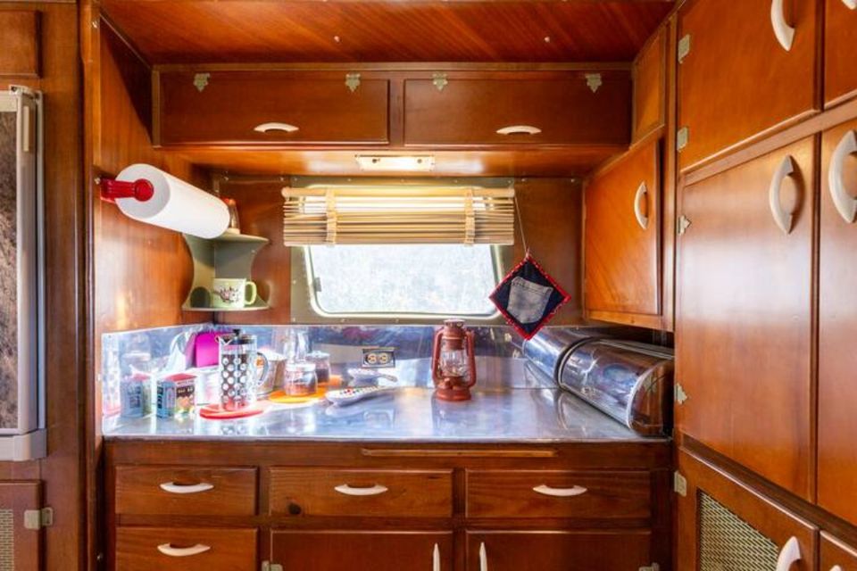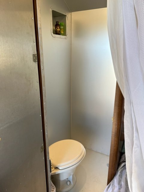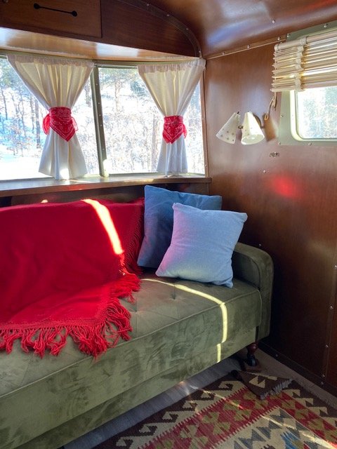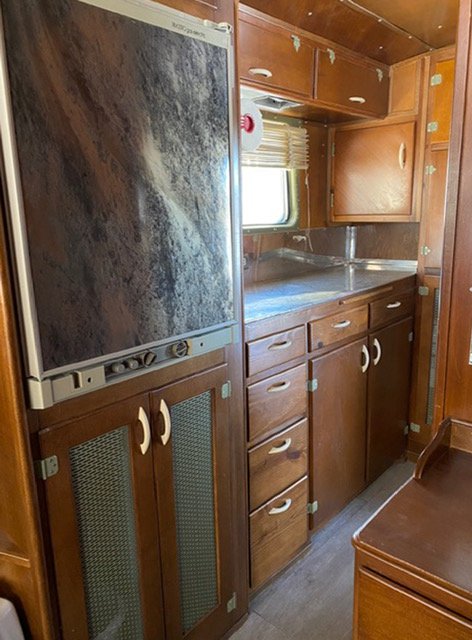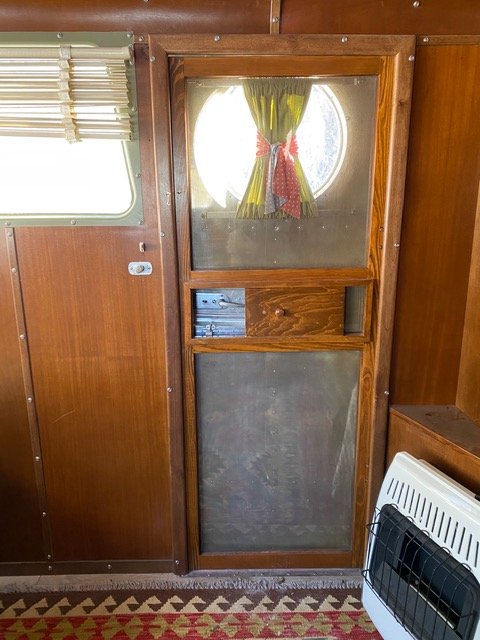As you can imagine, there was work to be done and without compromising on the originality, here is what we did: • Made new sill and some paneling • New front windows • Installed a Dometic gas/110 volt Fridge • Buck riveted aluminum shower • Toilet and black water tank • On demand hot water • New wiring • New 30A WFCO power center • New pex water piping • Solar charger • Twin 6v AGM batteries • Inverter • Installed a new gas heater • Installed a custom drop down table Original parts that we love and kept: • Aluminum double sink • Aluminum counter tops • Cabinet pulls and latches • Original Venetian wood blinds • Cabinetry • Mahogany paneling • Wood and bronze screen doors • Sconce for light • The cone style wall lights • Stove • Shaving sink • Original steps • Mirror