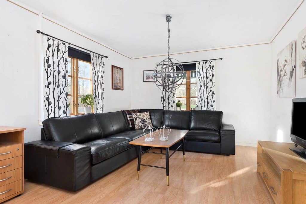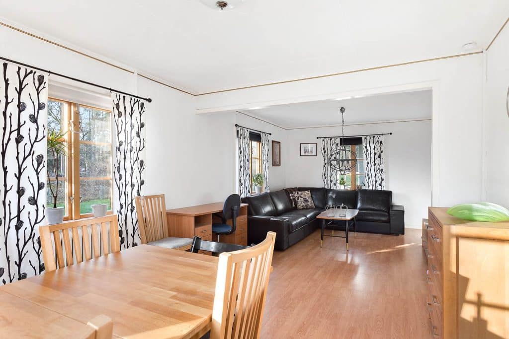 Large, bright living room and dining room in open plan, with plenty of space for both sofa furniture and dining table. Nice light from several windows in three directions. Laminate flooring.