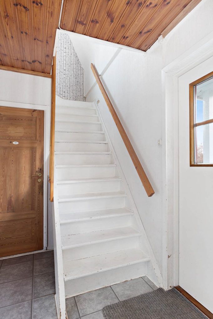 Smaller hall with space for hanging outerwear, stairs to upper floor, laminate floor.