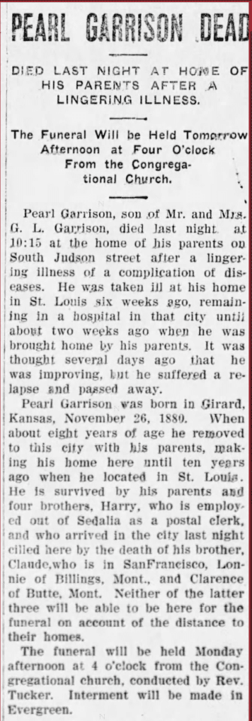 In 1908, the Garrisons suffered the tragic death of their son Pearl who died in the home from a series of illness.